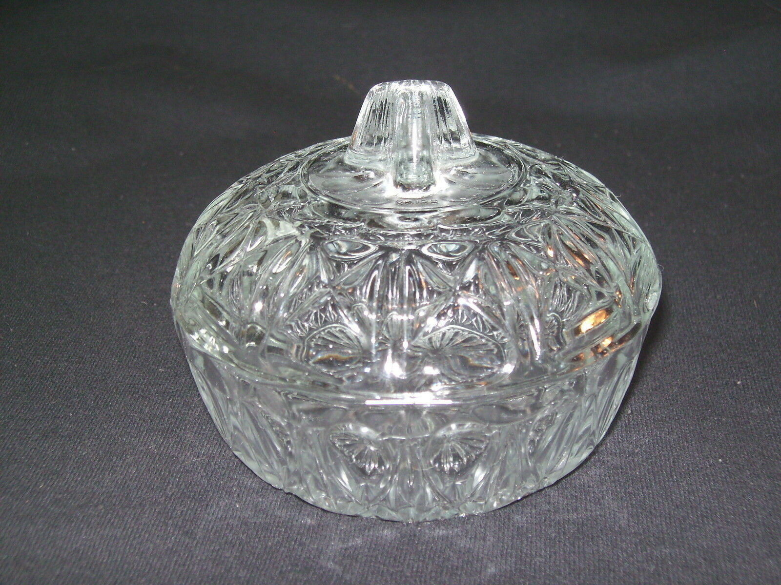 Jewelry Box Bowl Trinket Pot Round Glass Round Glass Jewelry Pot-Container. This cute little pot measure approx 4 1/4" across and 3 1/2 inches high to the tip of the handle on the lid. No chips or breakage. *_*