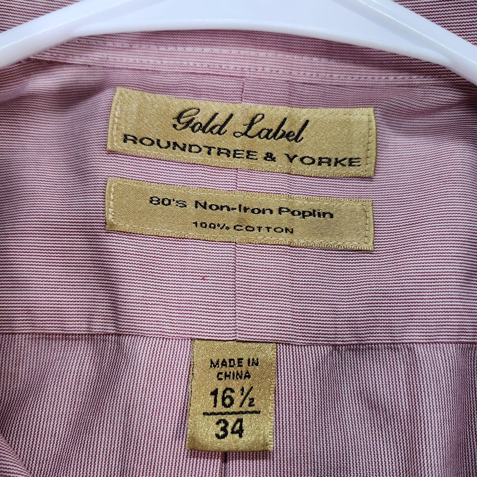 Brand: Roundtree & Yorke. Style: Mens long sleeve Gold Label dress shirt with button front closure. Color: Pink with subtle tonal micro stripe pattern. Size: Mens neck 16.5 with 34/35 sleeve length (neck tag shows 16 1/2 34). Material: 100% cotton non-iron poplin fabric with wrinkle-resistant finish. Construction: Lightweight woven poplin with a comfortable regular fit suitable for business and dress wear. Design details: Point collar, full front button placket, single chest pocket, long sleeves, and barrel button cuffs. Back and hem: Straight back yoke with centered box pleat and a curved shirttail hem for easy tucking. Branding and labels: Gold neck label reading Gold Label Roundtree & Yorke, secondary label stating 80's Non-Iron Poplin 100% Cotton, and size tag marked Made in China 16 1/2 34. Features and use: Non-iron cotton dress shirt ideal for office, business casual outfits, or formal occasions requiring a pressed look with easy care.