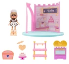 The "Royale High Baking Class Playset Doll" is a 3-inch fashion doll with brown straight hair and blue eyes. Part of the Royale High Series 1, this original Jazwares doll comes with doll accessories and a virtual item code for Roblox in the packaging. Ideal for all occasions, this collector toy features a light complexion and is a girl doll from the baking class character in the franchise.