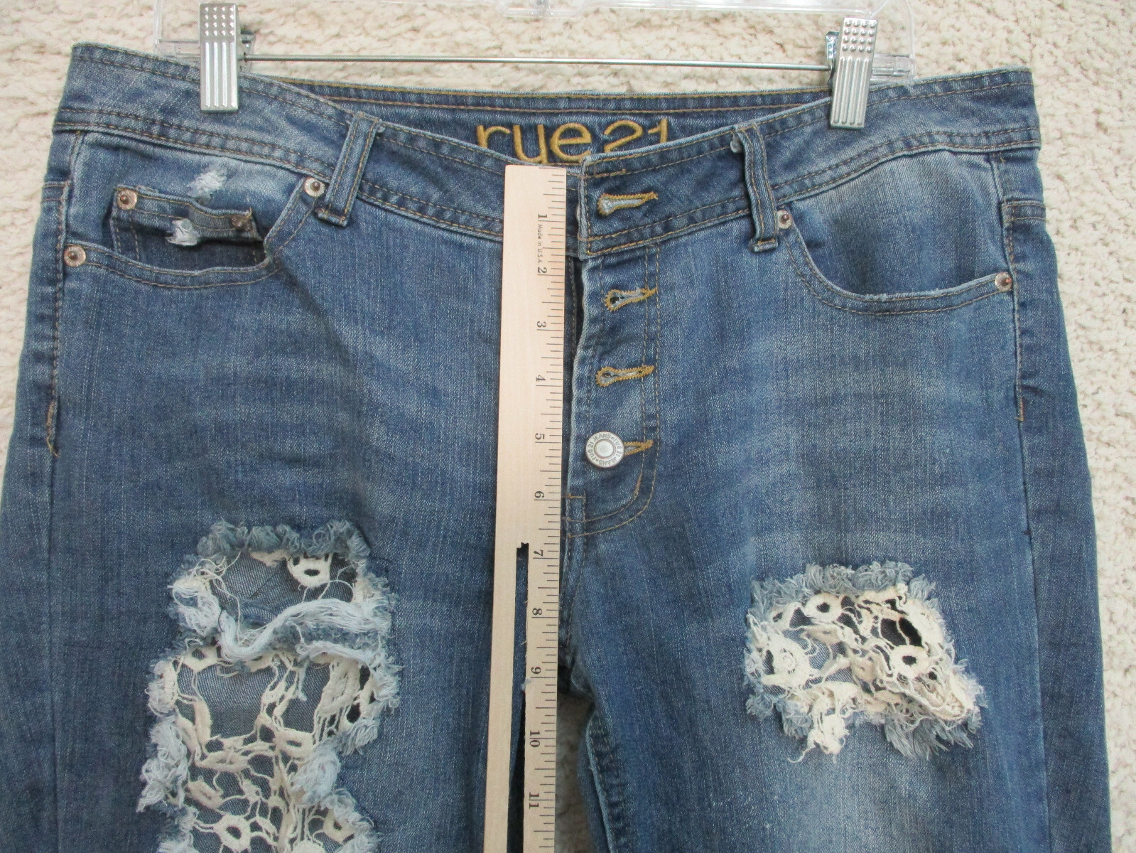 Rue 21 Jeans 10 Womens Regular Size Blue Denim Button Fly Distressed Straight C5