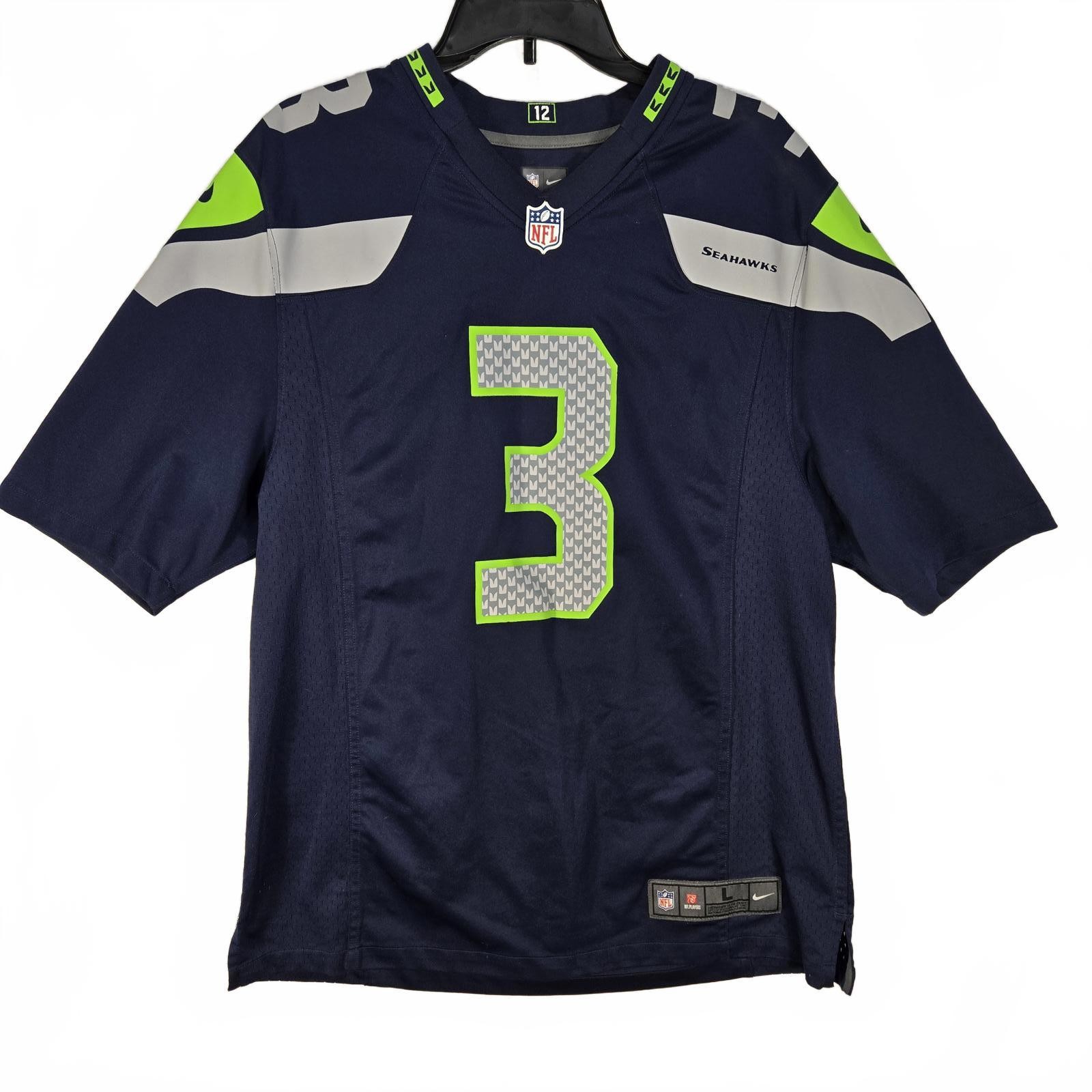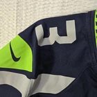 Seattle Seahawks Russell Wilson team jersey. This is a great piece of sports apparel and an essential for any streetwear or athleisure collection. The deep navy-blue color and neon "Action Green" accents make this a striking and bold piece. Perfect for game day, tailgating, or gorpcore and casual wardrobe. The jersey features stitched numbers (with a unique patterned print) and a stitched nameplate. Flat measurement pit to pit - 23 inches Brand: Nike / NFL Style Number: 472511-419 Material: 100% Recycled Polyester Made In: Guatemala Condition: Good pre-owned/used (Please see all images for the exact condition.) Some cracking is visible on the graphic.