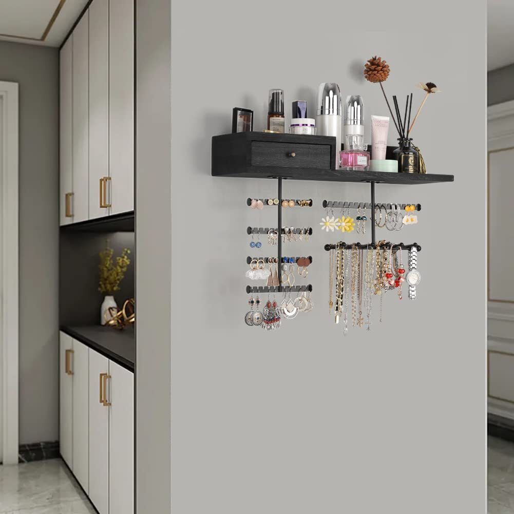 Innovative Improved Jewelry Organizer:Totally 6 rods,allowing you freely place earrings,necklaces,bracelets,watches,eye glasses etc..Large capacity earring organizer:58 slots instead of holes,directly place and fetch;Necklace organizer:branched rods instead of single rod,avoid tangling,directly get the piece you want;Ring&brooches organizer:wood drawer,lined with soft fine linen,divided compartment for rings and brooches;Ample space shelf for storing cosmetic,perfume bottles,display decor items Wall Mounted Jewelry Organizer: Jewelry wall organizer is made of rustic wood with carbonized finish, creating a rustic and stylish look that complements a variety of decors. No tangled necklaces, no missing earrings, easily pick the right accessories for the day Large Capacity Jewelry Organizer: Wooden storage drawer for your percious ring and brooches, a shelf for perfumes, watches and eye glasses, 58 earring slots & 6 bracelet rod for storing all shapes and sizes of jewelry including rings, necklaces, bracelets, sets, large hoop earrings. It's time to show off your collection, outstanding hardwood made organizer for hanging all jewelry, perfect for storing your favorite jewelry Excellent Gift For Women: Every female have their own jewelry,and jewelry organizer is a necessary and lovely gift. This exquisite jewelry organizer is absolute a ideal gift for birthday, Christmas, New Year, Valentine's Day, anniversary and the perfect gift for mom, daughter, wife, girlfriend and female friend Enjoy Easy Setup: Wall mounting screws and anchors are included for easy quick installation, all you need to do is mount it on the wall with installed mounting brackets. The drawer lined with fine linen to keep your jewelry from scratching, plenty of divided space and organizers, greatly save your space, you can fit on your bedroom, closet, or bathroom wall. Get this jewelry organizer and say goodbye to the lost earrings and tangled necklaces 100% SATISFACTION SERVICE: Storing your makeup or daily accessories and protect your rings or earrings from scratches with this Jewelry Wall Organizer. Any questions about our product, please reach out to us