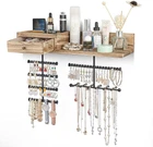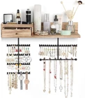 Innovative Improved Jewelry Organizer:Totally 6 rods,allowing you freely place earrings,necklaces,bracelets,watches,eye glasses etc..Large capacity earring organizer:58 slots instead of holes,directly place and fetch;Necklace organizer:branched rods instead of single rod,avoid tangling,directly get the piece you want;Ring&brooches organizer:wood drawer,lined with soft fine linen,divided compartment for rings and brooches;Ample space shelf for storing cosmetic,perfume bottles,display decor items Wall Mounted Jewelry Organizer: Jewelry wall organizer is made of rustic wood with carbonized finish, creating a rustic and stylish look that complements a variety of decors. No tangled necklaces, no missing earrings, easily pick the right accessories for the day Large Capacity Jewelry Organizer: Wooden storage drawer for your percious ring and brooches, a shelf for perfumes, watches and eye glasses, 58 earring slots & 6 bracelet rod for storing all shapes and sizes of jewelry including rings, necklaces, bracelets, sets, large hoop earrings. It's time to show off your collection, outstanding hardwood made organizer for hanging all jewelry, perfect for storing your favorite jewelry Excellent Gift For Women: Every female have their own jewelry,and jewelry organizer is a necessary and lovely gift. This exquisite jewelry organizer is absolute a ideal gift for birthday, Christmas, New Year, Valentine's Day, anniversary and the perfect gift for mom, daughter, wife, girlfriend and female friend Enjoy Easy Setup: Wall mounting screws and anchors are included for easy quick installation, all you need to do is mount it on the wall with installed mounting brackets. The drawer lined with fine linen to keep your jewelry from scratching, plenty of divided space and organizers, greatly save your space, you can fit on your bedroom, closet, or bathroom wall. Get this jewelry organizer and say goodbye to the lost earrings and tangled necklaces