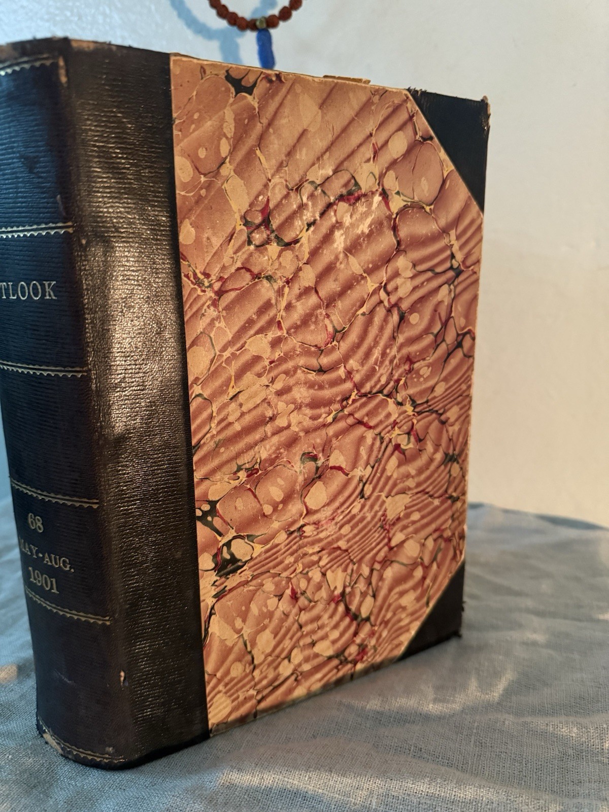 Leather bound/ marble boards volume of The Outlook magazine, May–August 1901, featuring in-depth political and cultural coverage from a pivotal moment in American history. This hardcover edition includes extensive reporting on the Pan-American Exposition in Buffalo, New York — the same event where President William McKinley would be assassinated just weeks later in September. Articles explore pressing issues of the Jim Crow era, including titles such as: • “Should the Negro Be Educated?” • “The Negro Disenfranchised in the South” Also includes commentary on Theodore Roosevelt, who was Vice President at the time and would assume the presidency following McKinley’s death. Topics span politics, religion, literature, social reform, international affairs, and race — all framed within the reform-minded tone The Outlook was known for. ⸻ Details: • Title: The Outlook – Bound Volume (May–Aug 1901) • Binding: Hardcover (marbled boards or leather spine if applicable) • Publisher: The Outlook Company, New York •