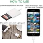 SD Card Adapter Camera Reader for iPad iPhone 12 11 Pro Max 6 6S 7 8 Plus Features: 【plug and play】No need third-party connection apps, no need internet connection, and share videos or photos with friends and relatives anytime and anywhere.easily download photos or videos from SD cards directly to the iPhone or ipad. 【Widely Applied System】This brilliant SD card reader for iPhone also works for digital camera, etc. You can directly view and share photos and videos from these devices on your iPhone and iPad. 【Fast Speed Camera Card Reader】Transfer the photos or videos to your phone from camera or memory card with the speed of 14 MB/S ~ 16 MB/S, making it much easier to share photos and videos with your families or friends anytime, anywhere. 【Wide Compatibility】Compatible with all iphones with iOS 9.2 and up and iPads with iOS 8.0 or later. Specification: Material: plastic Color: white Support system: Compatible with all iphones with iOS 9.2 and up and iPads with iOS 8.0 or later Support image format: JPEG/RAW Support video format:H.264/ MPEG-4 Support maximum SD card capacity:64GB Read speed:14 MB/S ~ 16 MB/S, USB2.0 transmission speed Package Included: 1x SD card reader 1x SD Card Adapter Note: 1.The image and video files must be at “DCIM” folder. 2.Not Include SD Card