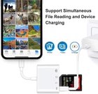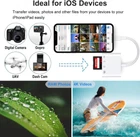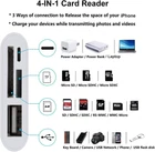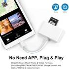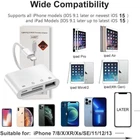 [4 IN 1 CAMERA CONNECTION KIT] Upgraded Multi-function, compact and portable design, more powerful and easy to carry; with the lighting charging port, you will never worry about the power shortage when transferring photos and videos. 1 x SD Card port (SD / SDXC / SDHC / RS-MMC / MMC Micro Card), 1 x Micro SD / T-Flash Card port (Micro SDXC / Micro SDHC / Micro SD Card), 1 x USB port(USB3.0), 1 x Female lighting charging port [WIDE COMPATIBILITY] Compatible with all iPhone/iPad with iOS 9.2 and later; through the lighting 4 in 1 camera connection kit, it is incredibly easy to download photos from your digital camera to your iPhone/iPad; it gives you two ways to import photos and videos, one is via using USB cable, the other is to read form SD/Micro SD card directly [PLUG & PLAY] No App required; the lighting SD card reader supports standard photo formats, such as JPEG and RAW and HEIF/HEVC etc; besides, it supports PC keyboard input/HUB/Ethernet adapters/Audio/MIDI interface; and the working current of the accessory is up to 500mA [FAST TRANSMISSION RATE] 50MB/S-70MB/S, faster transfer of photos and videos between two iOS devices at USB 3 speed; a great choice for downloading photos and video from a digital camera to your iPhone or iPad, so no need through the computer as a medium, direct to save photos on a mobile phone, so you can view and share them with family and friends anytime, anywhere Warm tips: The port of SD card / TF card and USB interface cannot be used simultaneously