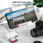 This SD card reader adopts USB-C connection and has 2 adapter ports for SD and TF/microSD memory cards and one standard USB-A 3.0 port for different needs. The microSD/TF card and the SD card cannot be read at the same time, please read them separately. This USB C Micro SD card reader is compatible with mobile phones, tablets and laptops equipped with a USB Type-C port. Compatible with SD / SDXC / SDHC / Micro SD / TF / Micro SDXC / Micro SDHC memory cards. USB C SD Memory Card Reader Adapter Compatible with MacBook, Samsung Galaxy Note 20, S21, S20, S10, S9, S8, A72, A52s, A32, A22, A12, Google Pixel 6, 5, 4a, 4 XL, 3a, 3a XL, 2 XL and more. It doesn't work with iPhone. Memory card is not included. Type-C SD/TF card reader supports USB OTG (On-The-GO) data transfer function. Plug and play, fast data transfer, compact and portable. Multiport SD Card Reader is compatible with Windows 11/10/8/7/XP, MacOS, Linux, Android and other operating systems. A USB-C to USB-A adapter is included for easy use with different devices. This SD card reader adopts USB-C connection and has 2 adapter ports for SD and TF/microSD memory cards and one standard USB-A 3.0 port for different needs. The microSD/TF card and the SD card cannot be read at the same time, please read them separately. This USB C Micro SD card reader is compatible with mobile phones, tablets and laptops equipped with a USB Type-C port. Compatible with SD / SDXC / SDHC / Micro SD / TF / Micro SDXC / Micro SDHC memory cards. USB C SD Memory Card Reader Adapter Compatible with MacBook, Samsung Galaxy Note 20, S21, S20, S10, S9, S8, A72, A52s, A32, A22, A12, Google Pixel 6, 5, 4a, 4 XL, 3a, 3a XL, 2 XL and more. It doesn't work with iPhone. Memory card is not included. Type-C SD/TF card reader supports USB OTG (On-The-GO) data transfer function. Plug and play, fast data transfer, compact and portable. Multiport SD Card Reader is compatible with Windows 11/10/8/7/XP, MacOS, Linux, Android and other operating systems. A USB-C to USB-A adapter is included for easy use with different devices.