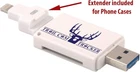 The Trail Cam Tracker trail camera SD card reader is the most REVOLUTIONARY product in the hunting industry since the trail camera itself. This MUST-HAVE trail camera card reader allows you to VIEW, ZOOM, SAVE, SHARE, OR DELETE game camera photos and videos while in the field! Check your trail camera while you are in your tree stand or hunting blind! SERIOUS HUNTERS WITH TRAIL CAMERAS AND A CELL PHONE MUST HAVE THIS PRODUCT. Simply insert trail camera card and reader into your phone charging port to view your photos! HOW IT WORKS: Visit App Store & download the EASY to use and FREE “i-FlashDevice” app for iPhone OR “QuickPic Gallery” for Android Micro USB connection. Insert SD card and the Trail Cam Tracker card reader into your phone to View, Zoom, Save, Share, or Delete Pictures or Videos within the app. FREE PROTECTIVE TRAVEL CASE! FREE LIGHTNING EXTENDER INCLUDED so card reader can be used with iPhone cases. *will not work with LifeProof FRE or NUUD cases for or battery cases. COMPATIBLE WITH ALL APPLE and iPad models with a lightning port connection. iPhone 4 or older models are NOT supported as the they do not have a lightning port connection. COMPATIBLE WITH ANDROID DEVICES containing a MICRO USB slot ONLY. NOT COMPATIBLE with Type C USB connection. Connect to Android phone by extending the micro USB connector from underside of USB port. A fingernail or small screwdriver will help. COMPATIBLE WITH ALL TABLETS AND COMPUTERS WITH USB SLOT. NO APP REQUIRED. IMPORTANT: Reader supports SD cards up to 128GB. Works with ALL trail cameras that use SD cards including Wildgame Innovations, Stealth Cam, Bushnell, Moultrie, Primos, Browning, Cuddeback, Reconyx, Muddy, Spypoint, Covert, & more! 100% SATISFACTION GUARANTEE! Return within 30 days for refund. Trail Cam Tracker offers the BEST customer service! Thanks for supporting our small family business.