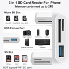 SD Card Reader for iPhone, 3-in-1 SD Card Reader, Memory card reader with USB Camera Adapter Plug and Play Trail Game Camera SD Card Viewer Supports SD and TF Card Micro SD Card Adapter for iPad 【Accessories for iPhone with Dual Card Slots】 This Memory Card Reader for iPhone Support SD Card and TF Card, Secure Digital (Standard SD/SDHC) and Micro SD(TF) card. SD Card Reader for iPhone Supports storage cards with capacities up to 2TB. Do NOT Support Wi-Fi SD Memory card. 【High Speed Data Transfer】It supports SD, Micro SD (TF) cards and USB flash drives, ensuring compatibility with all iPhones running iOS 9.2 or higher and iPads with iOS 8.0 or higher. Import data from SD/TF card to iPhone/iPad, or export the file from iPhone/iPad to SD/TF card. Include Movies, Music, Word, Power point, Excel, PDF, etc. 【The Female USB Interface】Light-ning to USB adapter has the Female USB Interface is a OTG Camera Adapter for iPhone 14/13/12/11/Pro/Pro Max series and iPad. supports Digital camera, SLR Camera, The USB camera adapter does not require an application, and there is no need to remove the camera's memory card. You Can also plug the USB Flash Drive, Card reader. 【3-in-1 SD Card Reader】Support fast transfers standard photo formats, including JPEG, RAW, along with SD and HD video formats, including H.264 and MPEG-4. Easily and quickly transfer photos/videos to device and share images/videos of your camera to social media anywhere. 【Plug & Play】Just plug iPhone SD Card Reader in and start transferring files.Noadditional apps required, use your iPhone built-in “Photos” or “Files” app to start transferring files immediately. SD Card Reader for iPhone fits comfortably in your pocket or wallet, ensuring you always have access to your photos.