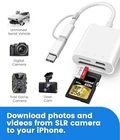 SD Card Reader Viewer for iPhone,iPad and Trail cameras. Two-way transfer : The SD Card Reader for iPhone supports two-way transfer,from SD card to iPhone or iPhone to SD memory cards. Double duty : The iPhone SD Card Adapter with Dual Slots is compatible with SD,SDHC,SDXC,MicroSD,MicroSDXC and MicroSDHC memory cards. Raw files : The SD Card Reader supports standard photo formats including JPEG,RAW,and 4K video formats including H.264 and MPEG-4. High-speed : Fast transfer speed,ensures high-speed syncing for raw photos,4k videos,and more. Play and Play : The SD Card Reader does not require third-party apps,uses the iOS built-in Photos or Files app,and supports play videos. Dual-Connector (Lightening&USB-C Ports) : The inclusion of both a Lightening cord card reader and a USB-C to lightening adaptor, ensuring compatibility with almost all your gadgets, from iPhone 5 - 14 to your USB-C iPhone 15 16, iPad, Macbook, Mac, Laptop or Android Devices. A must have for photographers : The SD card reader is a photography accessory for digital hunting trail cameras. If you like to take photos for fun or even if you are a photographer on the go who'd like to view their photos on a iPhone or iPad- possibly even uploading some from the field before, you need this! When plugged into phone with SD card in, you simply pull up your Photos app and a new tab comes up at the bottom that reads "Import" and you can directly upload the photos to your phone. so easy! What You Get: SD Card Adapter (2-in-1, Dual-slot), USB-C to Lightening OTG adapter, User manual and our friendly customer service.