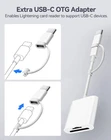 2 in 1 SD card reader for iPhone iPad Color: White Transmission Speed:SD card reader for iphone data transmission speed can reach 30MB/s~50MB/s Maximum Support Capacity: 512GB Easy to Use, Plug and Play The SD/Micro SD card reader for iPhone does not need to download third-party app, and does not need an Internet connection, so that personal privacy is safer. Powerful Function Connect the card reader directly, download photos/videos to your iPhone/iPad and share them with your family and friends in real time. Ideal for photography enthusiasts. Wide Compatible ✔ Double Slots, support SD, SDXC, MMC, RS_MMC, SDHC, Micro SD. ✔ Compatible with iPhone 15/1413/12/11/XS/XR/X/SE/7/7 Plus/6/5 and so on. ✔ Compatible with iPad, iPad Pro, iPad Air, iPad Mini and later models. ✔ Supports memory cards for digital cameras, sports cameras, drones, off-road game cameras and driving recorders. System Requirements For iOS 13 and iPadOS Users: 1. Supports two-way transmission via iOS Files APP.(transfer not only pictures and videos but also Word, Excel, and PDF, etc.) 2. You can view the full resolution directly in the files app. You can also long press the thumbnail in the "photos" app to view the full resolution directly. 3. For iOS 13, there is no pop-up, you can find 'import' in the "Photos" app or" Files "app. For iOS 9.2-12.4 Users: 1. Supports one-way transmission from SD/Micro SD to the iOS Device via iOS Photos APP. 2. You can directly view the full resolution by long pressing the thumbnail in the "Photos" app. 3. When the SD Card Reader is inserted, the Photos app will pop up automatically. 2 in 1 Card Reader Slot: The SD card reader for iPhone iPad compatible withSD/Micro SD (TF) cards, supports all iPhones with iOS 9.2 or higher and iPads with iOS 8.0 or later. With this memory card reader, you can download photos or videos from SD cards directly to the iPhone or iPad anytime and anywhere. Plug and unplug your cards easily. Super Speed Data Transfer: With 30 MB/s ~ 50 MB/s transfer speed of this SD card reader for iPhone, photos and videos of your camera can be transfered in a few seconds to your iPhone/iPad. Plug and Play: No need third-party connection apps, no need internet connection, without extra-drive or software, just connecting the iphone sd card reader to your device and wait for 1-3 seconds, share your happiness with your family and friends in real time. Excellent Compatibility: The SD card reader for iPhone supports standard photo formats (including JPEG and RAW) and SD/HD Video formats (including h. 264 and MPEG-4). Compatible with iPhone 15/14/14 Pro/14 Pro Max/13/13 Mini/13 Pro/13 Pro Max/12 Mini/12/12 Pro/12 Pro Max/11/XR/XS/X/8/7/6/5, iPad etc. Supports the memory card with a maximum capacity of 512 GB. Practical Assistant: The SD card reader for iPhone can make your life more convenient. File storage, data transmission, and a card reader are all done. USB-C to Lightening OTG Adapter: This SD Card Reader include USB-C OTG adapter that are compatible with your iPhone whether it has a Lightening connector or the latest USB-C connector.