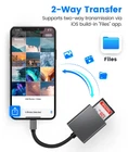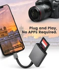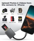 SD card reader for iPhoneiPad Using a dual-slot SD card camera reader, you can easily download photos and videos from your digital camera to your iPhone or iPad. And freely share photos and videos from your camera to your social network. No need to use PC anymore. A good idea for photographers, it is the best way to reproduce high-quality photos from the camera in a short time. SD card reader for iPhone Models: iPhone5,5C,5S. iPhone6,6S,6 Plus,6S Plus. iPhone7,7 Plus. iPhone8,8 Plus. iPhone X,Xs,Xs Max,XR,SE. iPhone 11,11Pro,11 Pro Max. iPhone 12,12Pro,12 Pro Max. SD card reader for iPad Models: iPad Mini,Mini2,Mini3,Mini4. iPad Air,Air2. iPad Pro 9.7 inch12.9 inch How to use this SD card reader? For iOS 13,iPadOS and later Users: The SD card reader can transfer not only photos and videos, but also Word, Excel and PDF etc. The sd card reader realizes the two-way transmission. Supports two-way transmission via iOS'Files APP. When inserting the SD Card Reader, you need to open the Photos or Files app manually. For iOS9.2-12 Users: Supports one-way transmission from SDMicro SD to the iOS Device via iOS Photos APP. When the SD Card Reader is inserted, the Photos app will pop up automatically. 【SD Card Reader for iPhone】The SD card reader for iPhone and iPad, compatible with standard SD and MicroSD memory card, with a maximum of 256GB. 【Plug and play】The SD card reader does not require any third-party apps, use iOS' Files App to transfer your photos and videos without privacy issues. 【High-speed transmission】 The SD card reader can easily quickly transfer photos or video to your iPhone and iPad, up to 30MB / s speed, support JPEG, RAW, and H.264 4K videos. 【Excellent design】The SD card reader is designed with aluminum alloy shells and nylon weaving to make it more durable. Will not use inexpensive plastic shells and white plastic lines like other brand products. 【Perfect choice for photographic designers】The SD card reader is compatible with SLR camera, trail cameras, drones, sports cameras, dash cams, and more. Let you quickly uplopad wonderful photos and videos to your iPhone and iPad.