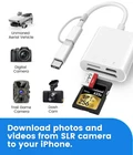 Two-way transfer : The SD Card Reader for iPhone supports two-way transfer,from SD card to iPhone or iPhone to SD memory cards. Double duty : The iPhone SD Card Adapter with Dual Slots is compatible with SD,SDHC,SDXC,MicroSD,MicroSDXC and MicroSDHC memory cards. Raw files : The SD Card Reader supports standard photo formats including JPEG,RAW,and 4K video formats including H.264 and MPEG-4. High-speed : Fast transfer speed,ensures high-speed syncing for raw photos,4k videos,and more. Play and Play : The SD Card Reader does not require third-party apps,uses the iOS built-in Photos or Files app,and supports play videos. Dual-Connector (Lightening&USB-C Ports) : The inclusion of both a Lightening cord card reader and a USB-C to lightening adaptor, ensuring compatibility with almost all your gadgets, from iPhone 5 - 14 to your USB-C iPhone 15 16, iPad, Macbook, Mac, Laptop or Android Devices. A must have for photographers : The Oyuiasle SD card reader is a photography accessory for digital hunting trail cameras. If you like to take photos for fun or even if you are a photographer on the go who'd like to view their photos on a iPhone or iPad- possibly even uploading some from the field before, you need this! When plugged into phone with SD card in, you simply pull up your Photos app and a new tab comes up at the bottom that reads "Import" and you can directly upload the photos to your phone. so easy! What You Get: Oyuiasle SD Card Adapter (2-in-1, Dual-slot), Oyuiasle USB-C to Lightening OTG adapter, User manual and our friendly customer service.