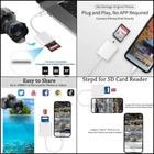 SD Card Reader for iPhone iPad,Lightning SD Card Camera Reader Adapter Converter 【Plug and Play】Don’t need any extra driver or third- party application! Insert a SD card and connect the SD card adapter to your Phone/Pad. Wait about 5s, then you can start to view or transfer data between Phone and SD card. 【High Speed Data Transmission】The sd card reader for phone data transmission speed can reach 20MB/S~30MB/S,the memory sd card reader for phone can transmit photos and videos of your camera to your device in a few seconds, saving a lot of time. 【Universal Compatibility】This adapter compatible with multiple devices, such as Phone 13 / 13 Pro Max 12 Pro Max/12 Pro/12 Mini/12/11 Pro Max/11 Pro/11/XS Max/XS/XR/X/8/8 Plus/7/7 Plus/6S/6S Plus/5/5S/SE and Pad Pro/Air/Mini/Pod touch(under the folder: DCIM. The IOS 13 and later models can read 4K video.) Support iOS 9.2- iOS15 and before. 【How to Use】Connect the SD Card Camera Reader to Phone/Pad, open the Photos app, which lets you choose photos and videos to import, then organizes them into albums. for iOS13+, is the two-way transmitter. You can transfer pictures, video, MP3 files, MP4 files, Excel, Word, PPT, PDF on Files App. 【Ideals for iOS Users】When you are traveling outdoors, you can share the camera pictures to the Pad and Phone without using a computer, fast and stable connection(wait for 3-5 seconds). With SD Card Camera Reader, you can transfer photos & videos from your high-resolution digital camera to your Phone and Pad directly. Specifications Material: ABS Weight: 0.5 ounces Size: 3.94 x 1.57 x 0.59 inches Maximum support capacity: 256GB High-speed transmission: SD card reader for phone data transmission speed can reach 20MB/s~30MB/s. Support Formats:SD card reader for phone/pad supports standard photo formats (including JPER and RAW) and SD and HD video formats (including H.264 and MPEG-4). sd card reader for phone The SD/micro sd Card Reader Compatible with sd and micro sd memory card,support all Phone with iOS 9.2 and up and Pads with iOS 8.0 or later memory card reader For iOS9.2-12.4:the SD/micro sd card reader only supports one-way transmission from SD/TF to the Phone/Pad, and does not support two-way transmission ONLY iOS 13 and later supports TWO-WAY transmission(transfer not only pictures and videos but also Word, Excel, and PDF, etc.) Instructions 1. Insert a SD card to the slot and connect it to Phone/Pad; 2. Open the “Files” App on Phone/Pad, find the SD card folder; 3. Start to view or transfer files between SD card and device. sd card reader *Warm Prompt* -----The SD card adapter for Phone supports 512GB SD card and micro SD card/TF card. However,due to the limitation of i0S system, only one card can be read at a time. Please do not read two cards at the same time.(Tips: For the Sony brand,the memory card only supports 256GB) -----For iOS 13,it is no pop-up, you can find 'import' in the "Photos" app or" Files "app. -----Please ensure that the memory card has been correctly inserted into the camera memory card reader. If photos or videos are not transmitted,unplug the reader and memory card and reconnect -----If the trail camera viewer is prompted that the cable or accessories have not been authenticated, it may be in bad contact, please pull them out and insert them again. If there's another problem with re-inser Shipping We offer FREE shipping on all orders! We ship within Three business days of payment, usually sooner. We use a selection of shipping services such as UPS, FedEx, USPS etc. We only ship to the lower 48 states, no APO/FPO addresses or PO Boxes allowed. Local pickups and combined shipping options are not provided at this time. Return You can return a product for up to 30 days from the date you purchased it. Any product you return must be in the same condition you received it and in the original packaging. Please keep the receipt. Payment We accept payment by any of the following methods: PayPal Please pay as soon as possible after winning an auction, as that will allow us to post your item to you sooner! Feedback Customer satisfaction is very important to us. If you have any problem with your order, please contact us and we will do our best to make you satisfied. Contact Us If you have any queries, please contact us via ebay. We usually respond within 24 hours on weekdays. Please visit our eBay store to check out other items for sale! Thank you for shopping at our store.