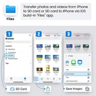About this item Two-way transfer : The SD Card Reader for iPhone supports two-way transfer,from SD card to iPhone or iPhone to SD memory cards. Double duty : The iPhone SD Card Adapter is compatible with SD,SDHC,SDXC,MicroSD,MicroSDXC and MicroSDHC memory cards. Raw files : The SD Card Reader supports standard photo formats including JPEG,RAW,and 4K video formats including H.264 and MPEG-4. High-speed : Fast transfer speed,ensures high-speed syncing for raw photos,4k videos,and more. Play and Play : The SD Card Reader does not require third-party apps,uses the iOS built-in Files app,and supports play videos.