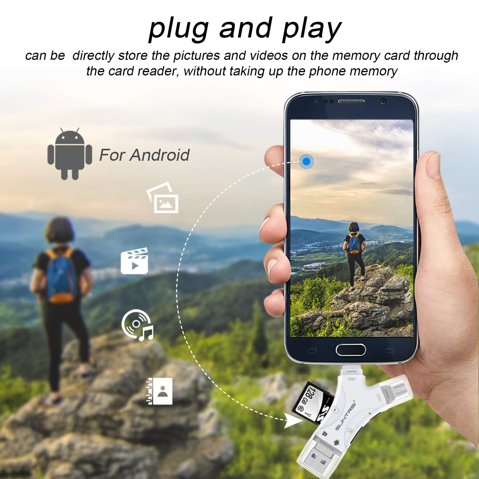 SD Card Reader for iPhone/ipad/Android/Mac/Computer/Camera,4 in1 Micro SD Card Reader Trail Camera Viewer, Portable Memory Card Reader SD Card Adapter for SD and TF Cards(White) 4 in-1 SD Card Reader:The memory card reader has various interfaces,usb / usb c(type c)/micro usb/sd card slot/micro sd card slot and iOS devices charging port for iPhone/iPad,which allows you to easily transfer the required files between different devices. With Charging Port : the sd card reader adds a charging port to its design. When you use an SD card adapter to charge your iphone/ipad devices, You can enjoy charging while transferring file data. No longer worry about power shortage. Real-Time Sharing and Data Management:High-speed two-way transmission allows you to save a lot of waiting time. micro sd card reader provides intelligent file viewing and management functions, allowing you to easily manage data between iPhone /ipad/ Android / computer and other devices. Compatibility:The sd/micro sd card reader support all iPhone with iOS 8.0 and up and iPads with iOS 8.0 or later/OTG Android phone/computer and other devices with usb port,Maximum support memory card capacity 512GB.(the package does not include sd card and micro sd card) Small and Portable:The slim and sleek design + keychain design allows the sd card reader to be placed into your pocket.When you are traveling outdoors or exploring, the keychain can prevent the memory card reader from being lost. And carry it with you. The sd card reader for iphone play an important role in our lives. It not only carries every bit of our lives, but also keeps our beautiful memories intact. Allows you to easily manage and backup files. Manage all data between devices and multiple platforms The extensive format support of the memory card reader makes you no longer worry about file format storage issues. ABOUT SUNTRSI SD CARD READER The design of the safety protection cover can protect each interface of sd card reader from being damaged (extended the service life of the micro sd card adapter) Universal compatibility (easily manage data between iPhone / Android / computer and other devices) Charging port (Added charging port supports simultaneous file reading and device charging) Ideal for photographers and outdoor sports enthusiasts (watch camera photos or videos at any time on mobile devices) The sd card reader for iphone supports a maximum of 512GB memory card Wi-Fi Transfer(Move file on Mac/PC to your iPhone/iPad with just single drag & drop when they're connected over same Wi-Fi network) For ios 1.The first use of this product, the phone automatically identify and prompt installation app 2.Search for "xDisk" in AppStore to install 3.Scan the QR code to install the xDisk APP For Android Devices: Connected Card Reader for android, no need to download app,Plug and Play(Pls make sure your OTG Function was opened), if your phone can not work,You need go to Android Setting to setting OTG connection turn on. For PC: No need to download app. Warm Tips: The maximum support is 512GB memory card, but due to different brands of memory card power consumption, and limited by the output power of mobile phone it is recommended not to use more than 256GB memory card Shipping We offer FREE shipping on all orders! We ship within Three business days of payment, usually sooner. We use a selection of shipping services such as UPS, FedEx, USPS etc. We only ship to the lower 48 states, no APO/FPO addresses or PO Boxes allowed. Local pickups and combined shipping options are not provided at this time. Return You can return a product for up to 30 days from the date you purchased it. Any product you return must be in the same condition you received it and in the original packaging. Please keep the receipt. Payment We accept payment by any of the following methods: PayPal Please pay as soon as possible after winning an auction, as that will allow us to post your item to you sooner! Feedback Customer satisfaction is very important to us. If you have any problem with your order, please contact us and we will do our best to make you satisfied. Contact Us If you have any queries, please contact us via ebay. We usually respond within 24 hours on weekdays. Please visit our eBay store to check out other items for sale! Thank you for shopping at our store.