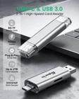 About this item 【USB 3.0 + USB C】 - Card reader 2-in-1 micro SD card reader, compatible with most devices with USB A, USB C and Thunderbolt 3 ports, such as all phones, tablets, computers, laptops that support OTG function. One card for multiple uses, say goodbye to the trouble of using multiple memory card readers. 【5Gbps High Speed】 - Both interfaces of the 3.0 USB card reader support high-speed transfer of up to 5Gbps, 10x faster than the USB 2.0 (480Mbps). Creating an extremely fast experience for you when transferring videos, files or sharing streaming, assisting you in processing your work in seconds. 【On-The-Go Date】 - Supports all OTG devices, let the devices play videos/music directly from an external memory card via card reader, and without occupying space on device. View digital camera, security camera, dashcam, game camera, drone, etc. at any time without occupying space on device. Supports simultaneous reading and writing of two cards, improving efficiency by accessing micro SD/SD cards simultaneously. 【Snazzy and Durable】 - Environmentally friendly aluminum shell material, simple and exquisite design. The transparent dust cover allows you to see the port at a glance when you want to use it. The aluminum shell is wear-resistant and has good heat dissipation, keeping the USB-C SD card reader from overheating to affect transmission. 【Wide Usability】 - The memory card is compatible with SD / SDXC / SDHC / MMC / RS-MMC / UHS-I, and Micro SD (TF) / Micro SDHC / Micro SDXC. Backward compatible with USB 2.0 and USB 1.1. External SD card adapter can be used on Windows 11/10/8.1/8/7/XP/Vista, Mac OS, Linux, Chrome OS, iPadOS, Android and other devices. No need to download any driver, just plug and play. * The memory card shown in the picture is not included in the product.