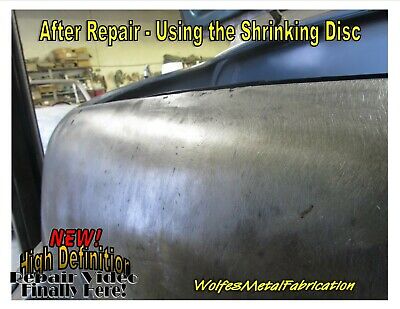 "Easy Shrink"™ Shrinking Discs This Listing: Includes the SD4Kit - 4 1/2" Shrinking Disc Kit See the Explanation of Contents below for more info. A Backing Pad and Tapered Nut are INCLUDED in this Kit! It is Highly Recommended to consider our "Kits"! They include everything you need in convenient trouble free packages! See ALL of our Disc & Kit Options Combined in ONE eBay listing! Because this listing has a lot of info, it is divided into the following sections to help you find the info you need. 1. Purchasing & Listing Info - (this section and above) MUST READ! 2. Quick Overview 3. "Explanation of Contents" - (Includes Fitment Info and RPM Requirements) MUST READ! Please double check to make sure you are getting what you want and need 4. Video Demonstrations 5. "Frequently Asked Questions" - Please review BEFORE contacting us! Your question has likely been asked before, like "Which size should i order?" If something is still unclear, please contact us for clarification, BEFORE ordering! 6. Customer Feedback - Comments from our Customers 2. Quick Overview A Few Satisfied Customer's Comments "The shrinking disc works fantastic, even for an amateur!!" "Been doing paint and body 25 years. A definite must have for fabricators!!!" "Amazing, I have been using a torch for 35 years, this is the way to go" "Thanks 4 the AWESOME tool! It's the most-used tool in our shop! You're the best!" Our "Easy Shrink"™ discs are made using a Special High Grade Stainless Alloy & Manufacturing Process, that creates a long lasting, low galling, crack resistant, safer and higher performance disc compared to older designs. Our Shrinking Disc Kits include everything you need in convenient trouble free packages! Works on steel, stainless, aluminum, brass Creates Heat through Friction to allow shrinking of the sheetmetal Works with compressed air or water cooling (spray bottle or rag) Is good for shrinking, smoothing, blending and relieving surface tension created from damage We are the inventor of the 1st and Original 3" and 4 1/2" shrinking discs, and were the FIRST to offer it! Better than Others Guaranteed! If your not satisfied and/or you find the competitors better, send it back and I will give you a refund! No one else offers this! We highly recommend that you compare our listings, feedback & sales history with others, before purchasing similar products from other sellers. Our Great Customer Service, Return Policy, Experience and Improvements to our tools, are things to consider when purchasing tools such as these. Wolfes Metal Fabrication is the inventor/innovator of the "Easy Shrink"™ Shrinking Discs, & an Insured and registered LLC Business, what about them? 3. Explanation of Options & Contents RPM Ratings 3" Discs - Recommended RPM 20,000 - 22,000, Max RPM 22,000 4 1/2" Discs - Recommended RPM 10,000 - 13,000, Max RPM 13,300 9" Discs - Recommended RPM 3,000 - 6,000, Max RPM 6,500 Adjustable Pin Wrench - Used to help tighten and loosen the nuts of the 4 1/2" and 9" discs. (this is an Optional Item!) SD3 - 3" Replacement Disc for the SD3Kit, for right angle die grinders or similar, has a 3/8" hole & is a direct replacement for the disc in our SD3Kit (Mandrel Not Included) SD3Kit - Fits standard right angle die grinders that accept 1/4" shank mandrels. Discs have 3/8" holes. Contents - SD3 Disc, 1/4" Shank x 3/8" Mandrel & Instruction Manual SD458 - 4 1/2" Disc, Least Common Option, ONLY for some older 4" grinders that require a 5/8" hole (Disc Only), Makita Part #743009-6 pad, #224501-6 Nut may work if pad is needed SD478 - 4 1/2" Replacement Disc for the SD4Kit, Fits 4 1/2" grinders, has a 7/8" hole & is a direct replacement for the disc in our SD4kit. (backing pad required) SD4Kit - Fits standard 4 1/2" grinders that have 5/8" - 11 spindle thread & use discs with 7/8" holes. Contents - SD478 Disc, Backing Pad, Nut, Spacer & Instruction Manual (Need a different thread size? We can swap it out) SD478C - 4 1/2" Replacement Disc for the SD4CKit that has a Curved face for concave or reverse curved panels. Fits 4 1/2" grinders, has a 7/8" hole & is a direct replacement for the disc in our SD4CKit. (backing pad required & is different than the SD4Kit pad) SD4CKit - Has a Curved face for concave or reverse curved panels. Fits standard 4 1/2" grinders that have 5/8" - 11 spindle thread & use discs with 7/8" holes. Contents - SD478C Disc, Backing Pad, Nut, Spacer & Instruction Manual (Need a different thread size? We can swap it out) SD49CP Combo Pack - 4 1/2" and 9" Replacement Discs for the SD4Kit and SD9Kit SD9 - 9" Replacement Disc for the SD9Kit, Fits Standard 7" or 9" sander/grinder/polishers & is a direct replacement for the 9" disc in our SD9kit. (backing pad required) SD9Kit - Fits standard 7" or 9" sander/grinder/polishers with a 5/8" - 11 threaded spindle. Contents - SD9 Disc, Backing Pad, Nut, Spacer & Instruction Manual Discounted Package Deals Our Popular "Easy Shrink"™ Shrinking Disc Kits put together in money saving discounted packages! DLX49 Basic - Includes the SD4Kit & SD9Kit (Used to be called our Deluxe or DLXKit) Basic Starter Kit that will let you tackle many common jobs DLX349 Advanced - Includes the SD3Kit, SD4Kit & SD9Kit Advanced Kit that adds the ability to tackle tight area & hood/trunklid sandblasting warpage repairs between & slightly under the backside bracing (shrink the blasted and stretched top skin from the backside) DLX3494C Expert - Includes the SD3Kit, SD4Kit, SD9Kit & the Curved SD4CKit One step above our Advanced Kit that adds the ability to repair concave or reverse curved areas. Helps you on your way to becoming an Expert Metalman! DLX3494C +2 Metal Master - Includes the SD3Kit, SD4Kit, SD9Kit & the Curved SD4CKit as well as 2 additional discs for each kit Our largest, most complete kit with the greatest discount & best value, used by true Metal Masters! Great for multiple material types, spares or large shops! A Detailed Instruction Manual is Included with all ord