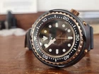 Plating on buckle and keeper is slightly worn, case edges are also slightly worn from being kept with other watches. WILL NOT WARRANTY. NO REFUNDS OR RETURNS. The SEIKO SBDX014G MARINEMASTER Emperor Tuna Watch is a luxurious and high-quality timepiece designed for men who appreciate both style and functionality. This diver's watch features a sleek black case with a rose gold titanium bezel, complemented by a two-piece black rubber strap for a secure and comfortable fit. With a water resistance of 1000 meters and a powerful automatic movement, this watch is perfect for underwater adventures and everyday wear. The black dial with round indexes and luminous hands adds to the overall aesthetic, making it a standout piece in any collection. Made in Japan, this Seiko watch combines sophistication and durability, ideal for those who value precision and reliability.