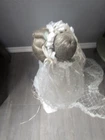This is a vintage Seymour Mann Connoisseur Collection porcelain doll from 1992 named Laura, measuring 22 inches tall. She has curly brown hair, blue eyes, and a light complexion. Handmade in Thailand, she is part of a Connoisseur Doll Collection and represents a bride. This doll is a single unit without packaging and is suitable for teens, adults, and youth collectors. SHE DOES HAVE ONE BROKEN HEEL ON HER SHOE BUT NOT NOTICEABLE WHEN SHE STANDS HER DRESS COVERS HER FEET