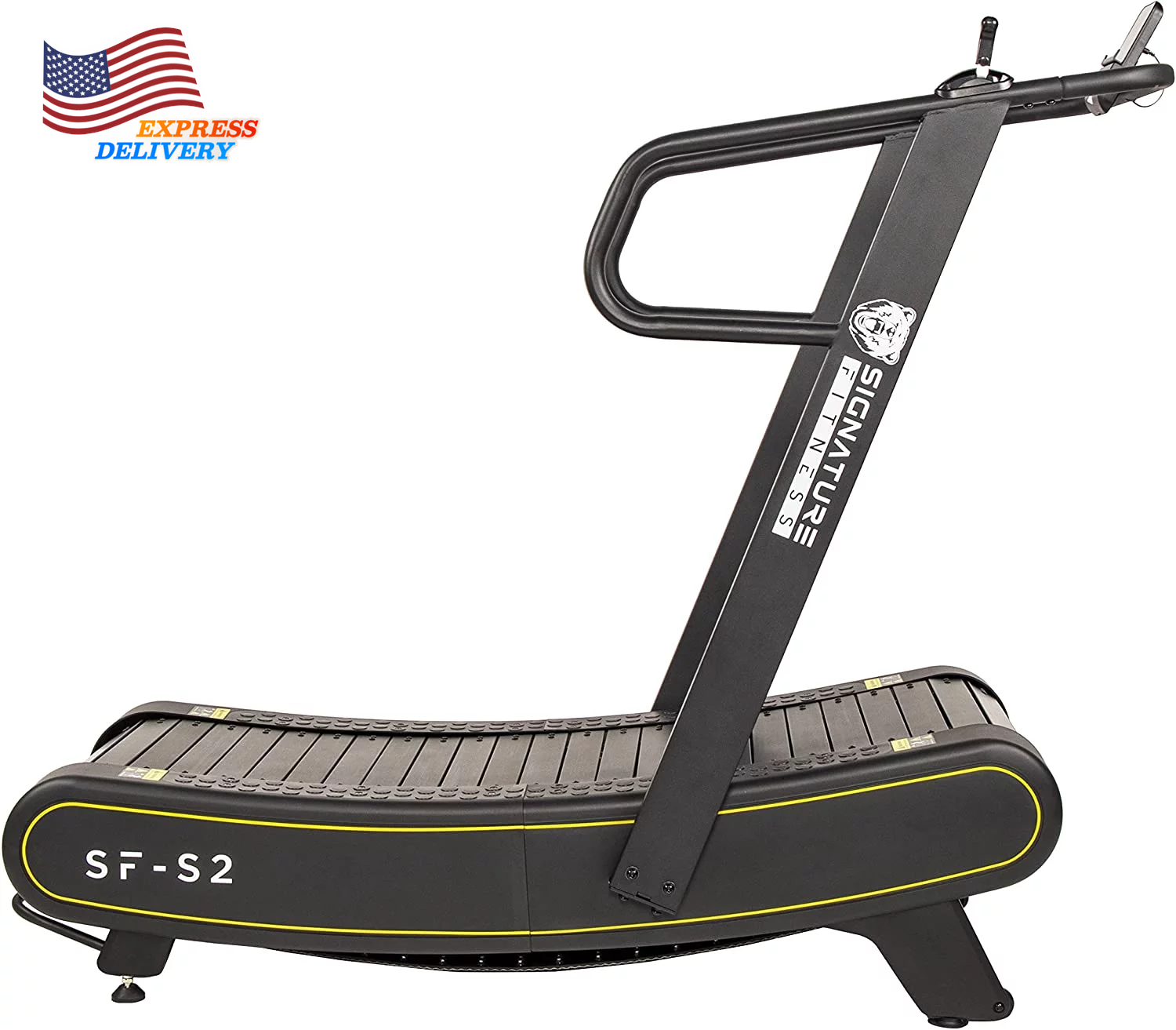 Introducing the Signature Fitness SF-S2 Sprint Demon, the ultimate motorless curved treadmill for high-intensity workouts. Designed for HIIT training, circuit training, sprints, short distances, and walking or power walking, this treadmill will take your fitness routine to the next level. Lightweight: Unlike traditional motorized treadmills, the SF-S2 Sprint Demon uses ultra-thin and flexible slats to offer cloud absorption, making it extremely lightweight and promoting less stress on joints and more activation of muscles. In fact, it can burn up to 30% more calories than a motorized treadmill! Customizable: With 7 levels of resistance, you can customize your workout according to your fitness goals. Start with low resistance for sprinting, move to medium resistance for walking, or crank up the intensity with high resistance for power walking or running while holding the handrails (which imitates a sled push). Multiple hand grips make it convenient to change hand positions when using the treadmill like a sled push. Portable: The SF-S2 Sprint Demon is also incredibly easy to move thanks to its lightweight nature and mobility wheels on the front of the treadmill, allowing you to move it within your home gym with ease. Trackable: The digital display shows calories burned, heart rate, and speed, allowing you to track your progress and adjust your workout as needed. There's also a large device holder for cell phones and tablets, so you can stay entertained while you train. Challenging: Whether you're a seasoned athlete or a beginner looking to step up your fitness game, the Signature Fitness SF-S2 Sprint Demon is the perfect choice for anyone looking to add a challenging and effective workout to their routine. Upgrade Today! Upgrade your fitness routine today with the Signature Fitness SF-S2 Sprint Demon and start experiencing the benefits of a motorless curved treadmill for yourself. AT A GLANCE: Motorless curved treadmill designed for high-intensity workouts Ultra-thin and flexible slats offer cloud absorption, promoting less stress on joints and more muscle activation Burns up to 30% more calories than a traditional motorized treadmill 7 levels of resistance for customized workouts Lightweight and easy to move with mobility wheels on the front Digital display shows calories burned, heart rate, and speed Large device holder for cell phones and tablets