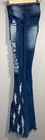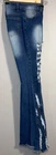 These SheIn jeans in light blue are designed with a distressed, frayed hem and a flared leg style. They feature a high rise waist, a 5-pocket design, and are made of a denim fabric blend. Accented with fringes, buttons, and embroidery, these jeans have a hippie, grunge-inspired look. Perfect for a retro, bohemian style, these jeans are a size L with a waist size of 31 inches and inseam of 32 inches.