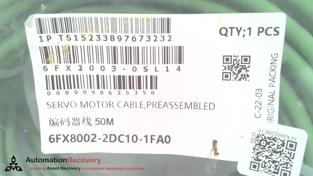 SIEMENS 6FX8002-2DC10-1FA0 PRE-ASSEMBLED SIGNAL CABLE GENERAL INFORMATION: MANUFACTURED BY: SIEMENS MANUFACTURER PART NUMBER: 6FX8002-2DC10-1FA0 DESCRIPTION: SIEMENS 6FX8002-2DC10-1FA0 PRE-ASSEMBLED SIGNAL CABLE TEST VOLTAGE: 500V RATED VOLTAGE: 30V MAX. CABLE OUTER DIAMETER: 7.1 mm LENGTH: 50 m CONDITION: FNSP-THIS IS A NEW ITEM IN ITS ORIGINAL BOX AND THE BOX HAS NOT BEEN OPENED. Common Shipping Questions: Below options must be expressed and communicated with the seller prior to payment. Shipping refunds will not be provided after payment. UPS & FedEx - We can provide shipping on your own shipping account for a $2 handling fee Warehouse Pickup – We are able to accommodate pickup at our warehouse DHL - We can help with DHL shipping. You will need to provide the label and arrange for pickup International buyers – please note: Import duties, taxes, and charges aren't included in the item price or postage cost. These charges are the buyer's responsibility. Please check with your country's customs office to determine what these additional costs will be, prior to buying. Learn more about what we do