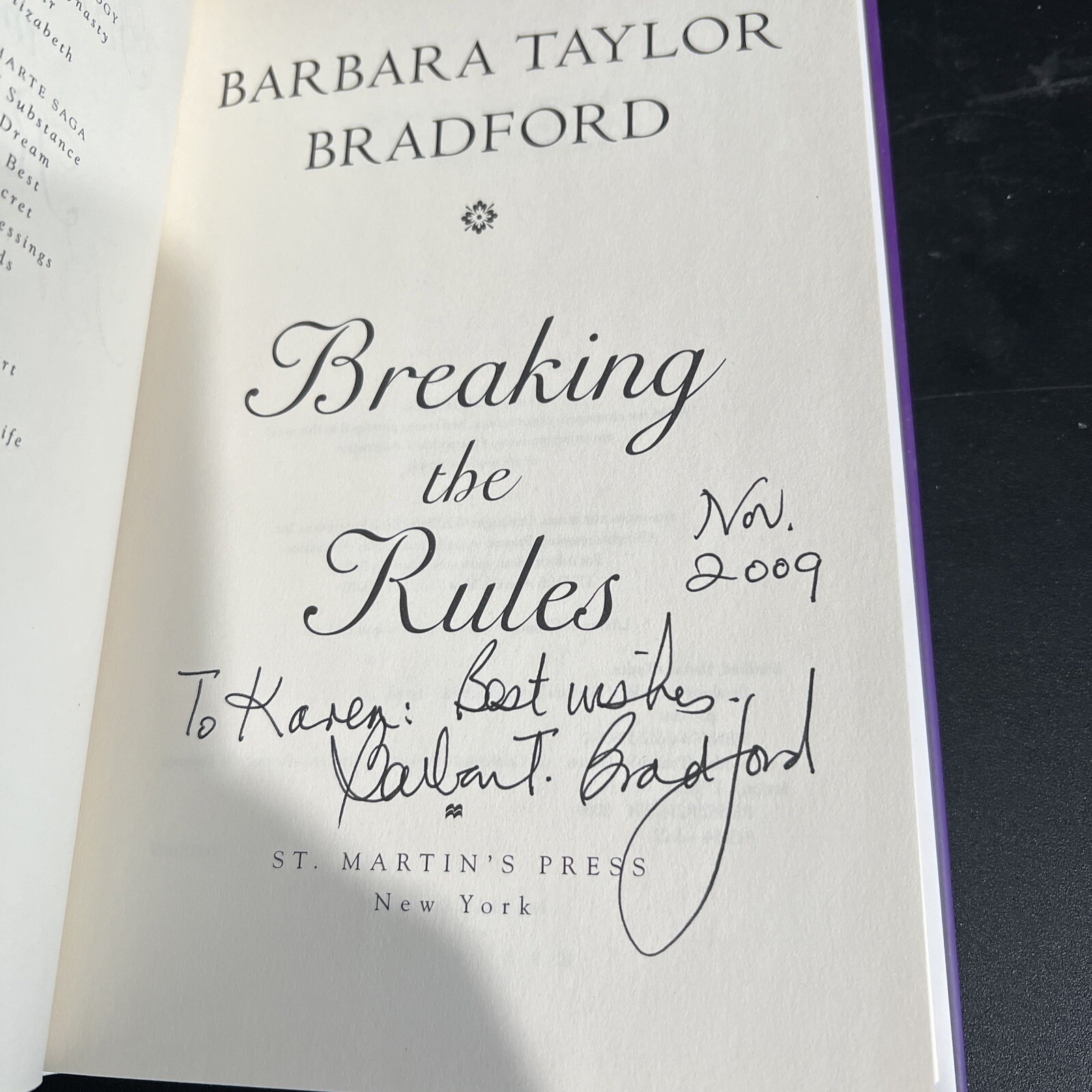This is a rare and valuable hardcover copy of "Breaking the Rules" by Barbara Taylor Bradford, signed by the author herself. This book is a first edition and a first printing, with a dust jacket included. The book is part of the Harte Family Saga series and was published by St. Martin's Press in 2009. The book is in excellent shape and has been well-maintained, with no signs of wear or tear. It is a contemporary women's novel with thrilling and suspenseful elements, perfect for fans of the genre. This item is a must-have for any book collector or fan of Barbara Taylor Bradford's work. The book is shipped via USPS Media Mail in a box 📦
