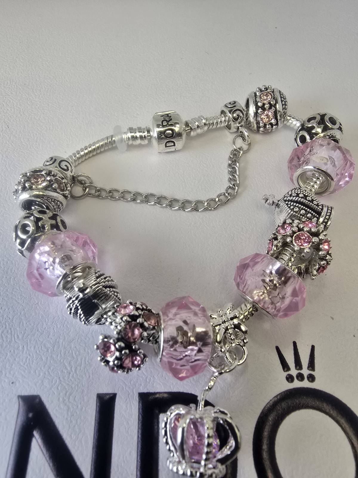 SILVER BRACELET WITH CRYSTAL CROWN AND LOVE EUROPEAN CHARMS,7.5" BEADS & CHARMS ARE NOT PANDORA! IN USING SILVER PLATED/TONED CHARMS THIS KEEPS THE PRICE AFFORDABLE! WHEREAS IF YOU WERE PURCHASING ALL PANDORA CHARMS & BEADS YOU WOULD BE AROUND $800 AND UP!! Each & every bracelet will either have a threaded charm or safety chain, clipped charm, or rubber stopper to hold all charms in place! All of these are easy to remove so you can add, remove, or switch out charms at any given time!