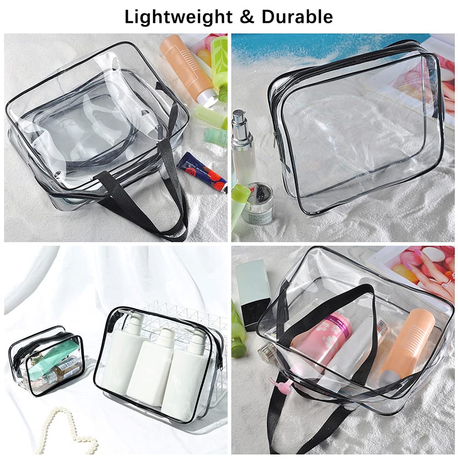 SITAKE 6 Pcs Clear Makeup Bags, Cosmetic Bags, Waterproof PVC Toiletry Bag Set with Zipper, Handle Portable Luggage Pouch for Women, Men, Vacation Travel, Bathroom, 3 Sizes Product Details Product Dimensions: 11.8 x 8.7 x 3.9 inches Item Weight: 1.04 pounds Department: unisex-adult Item model number: xisubao001 3 Different Sizes-- 2 x large makeup bag:11.8" x 3.9" x 8.7"; 2 x medium toiletry bag: 9.4" x 2" x 7.9"; 2 x small clear cosmetic bag: 7.1" x 1.6" x 5.5", very portable size, great for travel, 6 pcs in total. Quality PVC Material-- All the makeup bags are made from the premium PVC material, lightweight, durable and waterproof, package includes 6 pcs zippered cosmetic case of 3 different sizes, can freely meet your various needs. Sturdy Zippers & Transparent Design-- Design with large opening zipper on the top, making the makeup bags more easy to use; Besides, the transparent design can help you identify the stored contents quickly, save your time. Multipurpose Storage Organizer-- The portable toiletry bags can be widely used to carry your different cosmetics, toiletries, baby items, stationery supplies and so on, great storage organizer for travel, swimming, camping, fitness and bathroom. Warm Up-- The bags may have some odor, please wash the outside and inside of the clear cosmetic bags with soap water to remove surface dust firstly, and then put the bags in a well-ventilated place, the smell will disappear within days.