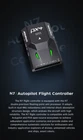 SIYI N7 Autopilot Flight Controller The SIYI N7 flight controller is equipped with the H7 double-precision floating-point unit processor. It adoptsbuilt-in dual IMU redundancy and internal shock absorption structure design, which endows the aircraft with highreliability. The N7 flight controller is compatible with both Ardupilot and PX4 open-source ecosystem to achieve adbundant application scenarios and provide stable andcomprehensive systematic solutions for enthusiasts andindustry application explorers of drones, unmanned vehicles and ships, smart robots. Specifications: Hardware Main Processor: STM32H743IIK6 (32 Bit Arm Cortex-M7, 480 MHz, 2 MB memory, 1 MB RAM) Coprocessor: STM32F103 (32 Bit Arm Cortex-M3, 72 MHz, 20 KB SRAM) Sensors Accelerometer / Gyro: BMI088 / ICM20689 Electronic Compass: IST8310 Barometer: MS5611 External Interface UART Serial Port: 4 I2C: 3 CAN: 1 PWM Output: - 8 x Standard PWM IO - 5 x Programmable IO RC Input (SBus): 1 Power Module Input: 1 GPS & Safety: 1 USB (Type-C): 1 TF Slot: 1 Overall Compatible Model: PX4 / Ardupilot Firmware (Planes / Multirotors / Helicopters / VTOL / UGV / USV) Power Module Voltage Input: 4.5 ~ 5.5 V USB Voltage Input: 5 V ( ± 0.25 V) Servo Voltage: 0 ~ 10 V Working Temperature: -20 ~ 65 ℃ Product Dimension: 47 x 68 x 19 mm Product Weight: 57g