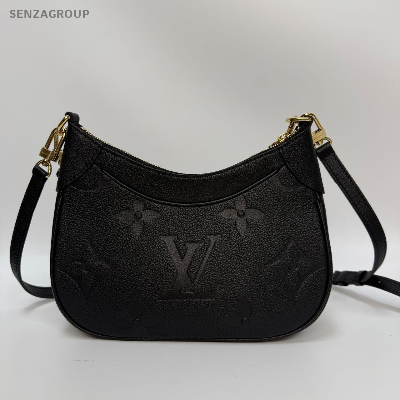 The Louis Vuitton Bagatelle Monogram Empriente is a classic shoulder bag crafted from black leather with a monogram empriente pattern. It features a zip closure, gold-plated hardware, and a detachable black leather strap for a versatile styling option. This designer bag from France is part of the Louis Vuitton Bagatelle product line, perfect for women who appreciate timeless elegance and luxury accessories. With its sleek design and high-quality materials, this bag is a stylish and sophisticated addition to any outfit.