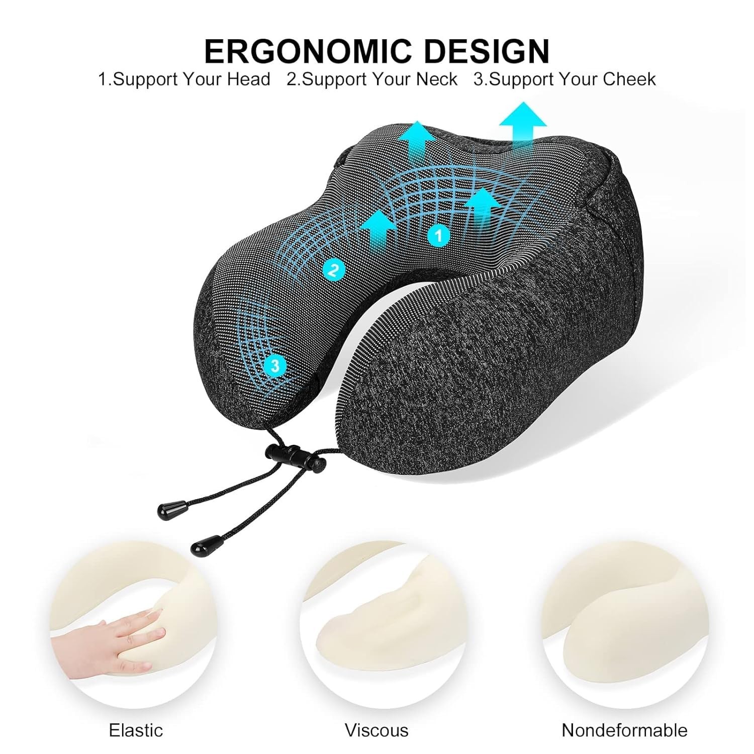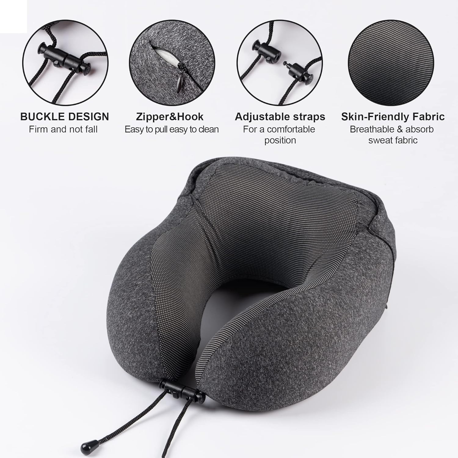 Travel Pillow 100% Pure Memory Foam Neck Pillow, Comfortable & Breathable Cover, Machine Washable, Airplane Travel Kit with 3D Contoured Eye Masks, Earplugs, and Luxury .Dark Gray. COMFORT DESIGN: Memory foam travel pillow provides ergonomic neck and head support during travel, with a soft and supportive construction COMPLETE SET: Package includes a plush neck pillow, convenient drawstring storage bag, sleep mask, and ear plugs for comprehensive travel comfort PORTABLE FEATURES: Adjustable drawstring closure allows customizable fit, while the included storage bag makes transport and packing simple PREMIUM MATERIAL: Dark gray memory foam core maintains shape while providing optimal support for extended comfort during long journeys VERSATILE USE: Perfect for airplanes, cars, trains, buses, or office napping, offering reliable neck support in multiple settings