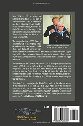 From 1964 to 1972, far beyond the battlefields of Vietnam and the glare of media distortions, American Green Berets and their indigenous troops fought a deadly secret war in Laos, Cambodia and North Vietnam under the aegis of the top secret Military Assistance Command Vietnam — Studies and Observations Group, or simply SOG. The inaugural edition of SOG Chronicles Volume One will be the first in a series of books focusing on the many untold stories from that eight-year secret war where Green Berets went deep behind enemy lines without conventional support from artillery, tanks, or ground support troops where communist forces massed 50,000-100,000 troops to combat them while keeping the Ho Chi Minh Trail supply lines open. The centerpiece of SOG Chronicles Volume One is the 1970 story of Operation Tailwind, features a SOG element of 16 Green Berets and 120 indigenous soldiers that went deeper into Laos than any operation during the secret war. Every Green Beret received at least one Purple Heart, including the sole medic, Gary Mike Rose. He is slated to receive the Medal of Honor from President Donald J. Trump in October 2017 for his valor and medical skills tending to more than 60 wounded troops during that four-day mission. “John Meyer’s story about Operation Tailwind does justice to the valor and heroism of the men involved in the four-day battle. Meyer writes about this historic SOG mission with clarity and attention to detail that is long overdue in regards to this top secret mission. SOG Chronicles Volume One is mandatory reading for anyone remotely interested in SOG history or simply in how the Green Berets operate deep behind enemy lines.” —Billy Waugh, SOG/CIA operative