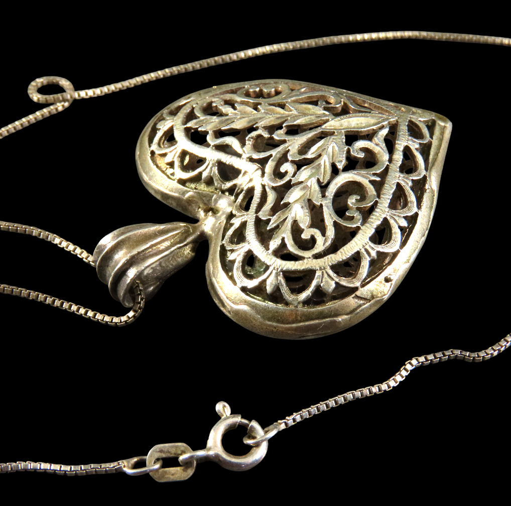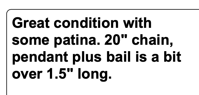 Great condition with some patina. 20" chain, pendant plus bail is a bit over 1.5" long. We are so thankful for our customers! We have thousands of listings, and therefore receive hundreds of messages, every single day. So, if you are asking about a price drop, or a shipping price drop, or asking for extra measurements, or to add additional photos, please allow me to answer you here, No thanks. If your question is not one of those questions, we will be happy to answer you individually. YES...WE DO COMBINE DOMESTIC SHIPPING. Extra jewelry items ship for $2 each (except for large jewelry lots). We will refund the difference as we are mailing out.....we hope you enjoy shopping with us!