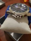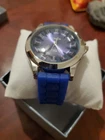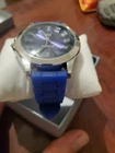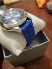 This is a men's Strada watch with a modern design featuring a dark blue dial and blue silicone band. It has a round case with IP plating, a quartz movement, and is water-resistant. The watch has a silicone band with a buckle closure and comes with a box. It is a fashion watch with an analog display, suitable for everyday wear. It may need a battery from never being used. A battery is cheaper than lunch.
