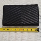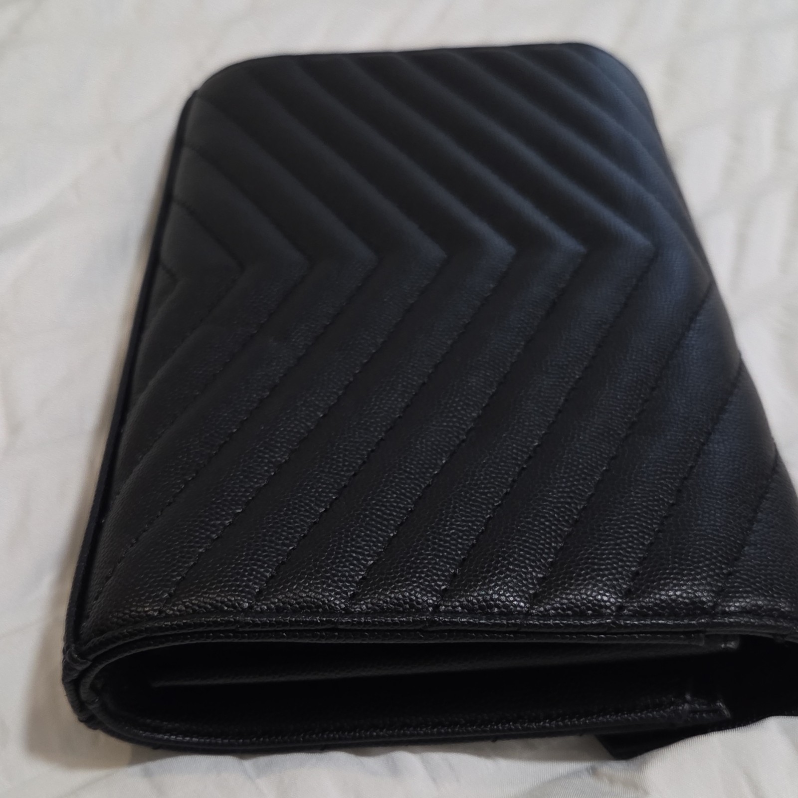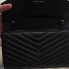 The Saint Laurent Black Women's Wallet on chain crossbody Quilted Envelope bag is a luxurious accessory designed for women. Made of leather with a chevron pattern, this wallet features a zipper closure, multiple credit card slots, and a folding design. The stylish envelope shape and quilted accents add a touch of elegance, making it a perfect statement piece for any outfit. The chain crossbody design offers convenience and versatility, while the signature logo detail adds a touch of high-end fashion. This wallet is a must-have for any fashion-forward woman. The chain is not included.