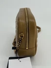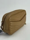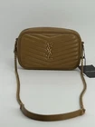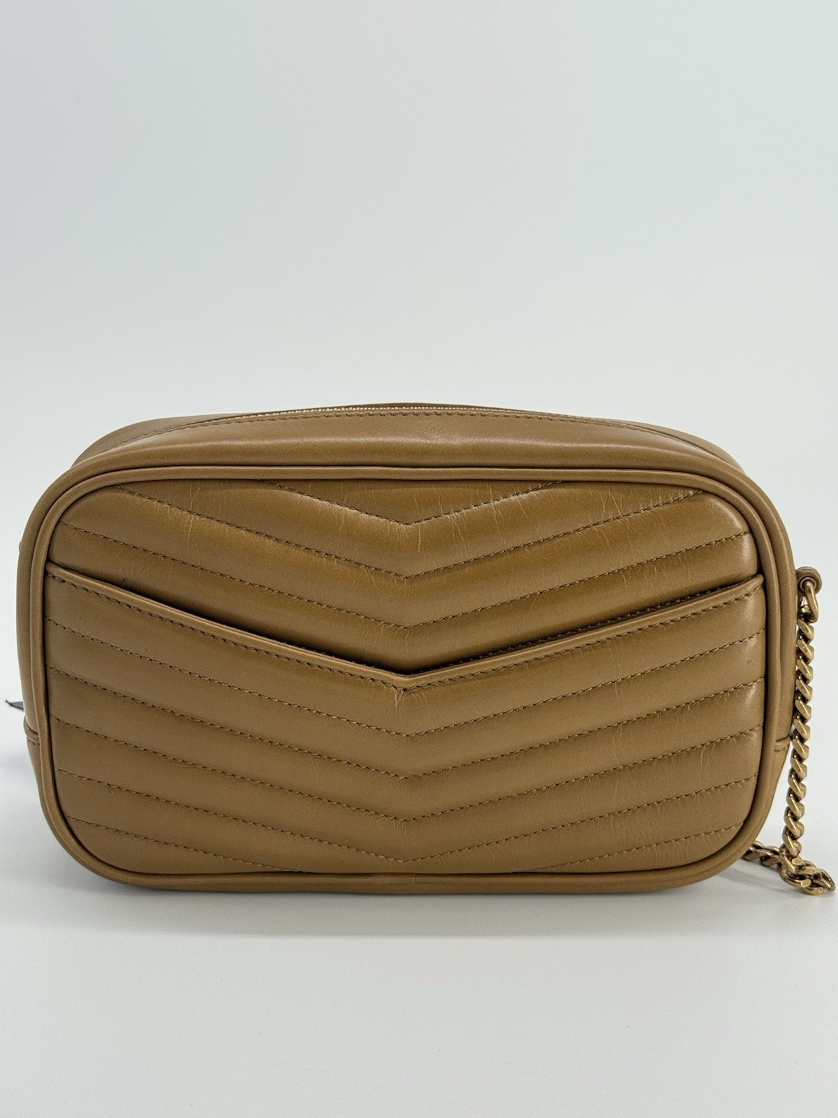 The Saint Laurent Lou Camera Bag Matelasse Chevron Leather Mini is a stylish and luxurious crossbody bag designed for women. Made of brown leather with a matelasse finish and chevron pattern, this mini bag features a zip closure and a gold metal crossbody strap. With a rectangular shape and a height of 5 inches, this bag is perfect for casual occasions and comes with its original dust bag and box. Made in France, this designer bag from the Saint Laurent Lou collection exudes sophistication and elegance.