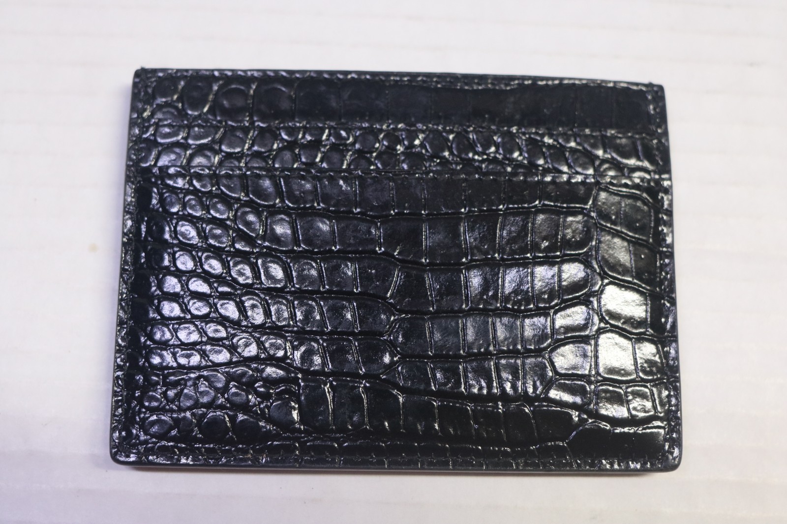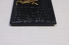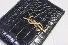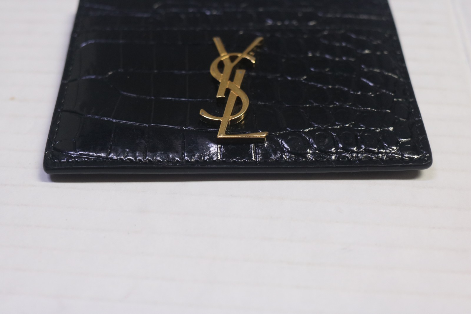Saint Laurent Shiny Black Leather Croc Print Cassandre Card Case Wallet Goldtoned metal hardware Five card slots Leather lining Calfskin leather, metal Made in Italy Dimensions: 4" x 3 x 0.1" inches