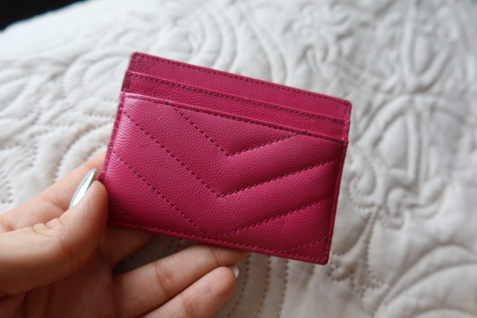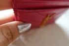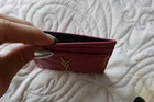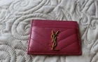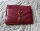 Authentic Saint Laurent (YSL) leather chevron card holder / card wallet in pink with gold-tone YSL logo. Compact and slim, perfect for everyday use. Features: multiple card slots + center pocket (see photos). Condition: Pre-owned, good condition. Shows light signs of wear from normal use (minor surface marks/scuffs; stitching and structure are intact). Please review all photos for details and exact condition. Ships carefully and fast.
