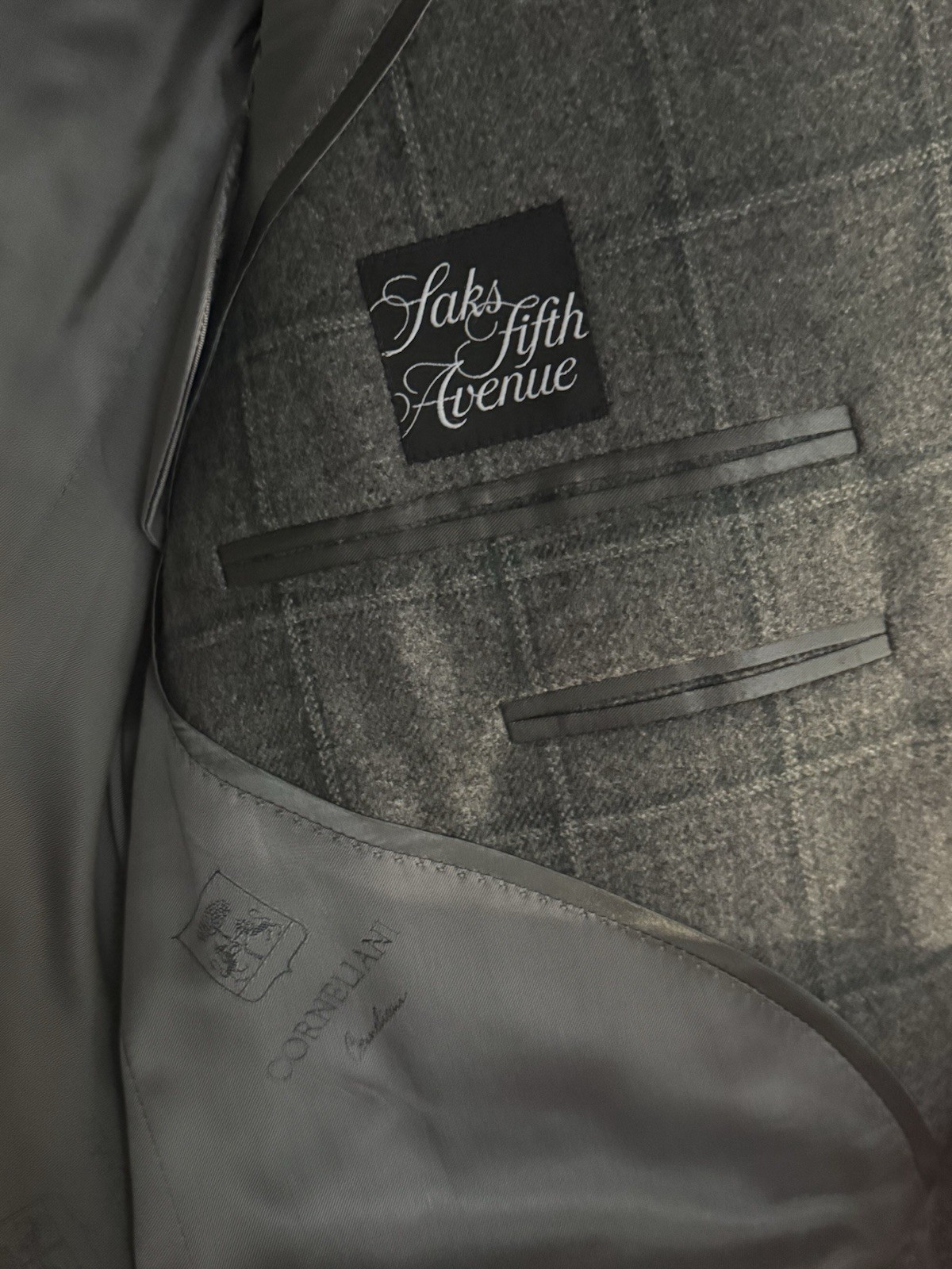This Saks Fifth Ave blazer - Corneliani - is a luxurious piece made of Cashmere wool and silk, featuring a classic check pattern in shades of gray, and darker tones. Designed with a 2-button single-breasted front and double-vented back, this blazer is perfect for various occasions including parties, casual outings, and business meetings. Crafted in Italy, this designer piece exudes a timeless elegance and sophistication, making it a versatile and stylish addition to any man's wardrobe. The blazer also includes inner pockets and a notch lapel for added convenience and detail. *Please see all pictures before purchasing. If you have any questions, feel free to ask! :)
