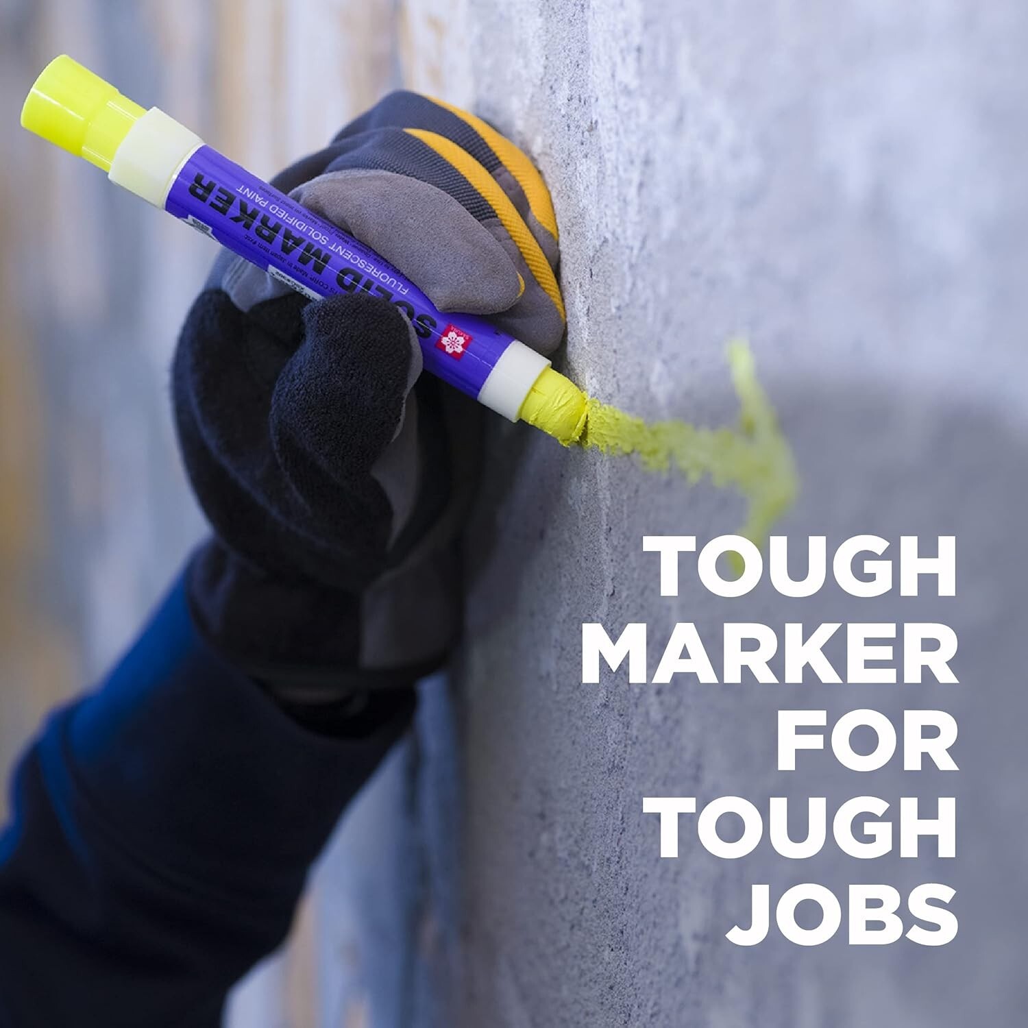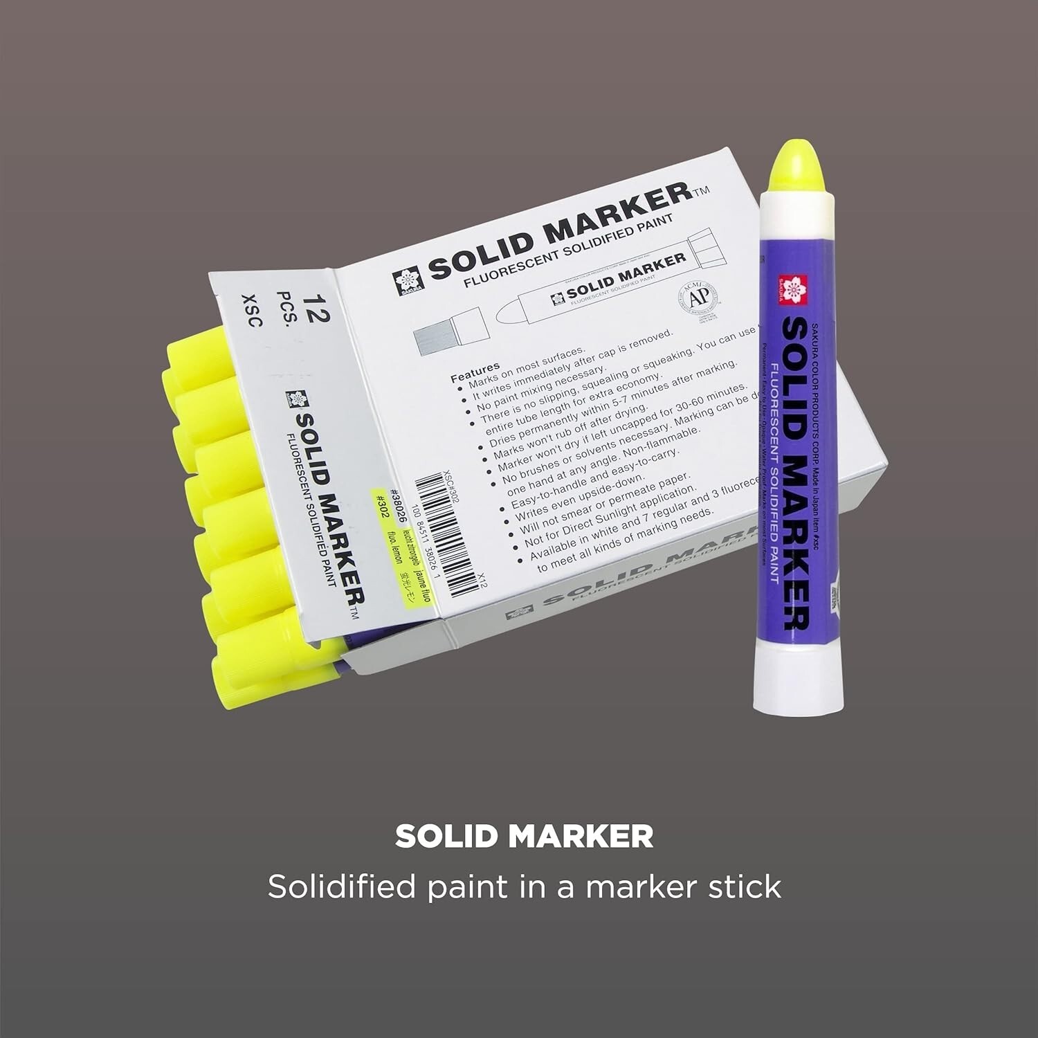 XSC- 302 FLUORESCENT LEMON Paint Markers box of 12 BY SAKURA ONE DOZEN Order by 3pm Central time and I ship the same day. FAST SHIPPING !!!!!!!!!! AMERICO SUPPLY IS A NATIONAL DISTRIBUTOR FOR SAKURA OF AMERICA Product Overview FLUORESCENT LEMON PAINT MARKER The tough marker for tough jobs, the Solid Marker is solidified paint in a marker stick. It marks through oil, grease, rust, mud, snow—inside or outside. Dries within minutes, and is permanent once dry. Solid Markers won’t fade or wash off like chalk. The special “stay fresh” twist mechanism keeps paint fresh and ready to use. Ideal for use on wood, cloth & canvas, plastic, steel & iron, rubber, cardboard, glass, fiberglass & concrete. Solid marker features a tough, broad stroke, is quick-drying and virtually odorless. This marker is widely used in commercial and industrial applications in construction, wielding & fabricating , pipelines & drilling, assembly lines, automotive tires & windshields, HVAC, systems or with stencils. Available in 11 colors: black, red, blue, green, purple, orange, yellow, white, fluorescent lemon, fluorescent orange and fluorescent pink. Working temperature range: 14°F to 392°F (-10°C to 200°C) 13 mm wide mark can be trimmed with knife for smaller marks. Alcohol based cleaners will remove ink from non-porous surfaces. Fluorescent colors are not lightfast. Meets ASTM and ACMI non-toxicity standards, and is AP seal certified.