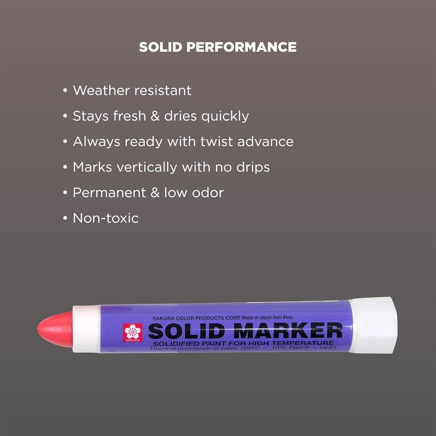 XSC- 19 RED PAINT MARKER 12 ONE DOZEN ONE BOX Order by 3pm Central time and I ship the same day. FAST SHIPPING !!!!!!!!!! AMERICO SUPPLY IS A NATIONAL DISTRIBUTOR FOR SAKURA OF AMERICA Product Overview The tough marker for tough jobs, the Solid Marker is solidified paint in a marker stick. It marks through oil, grease, rust, mud, snow—inside or outside. Dries within minutes, and is permanent once dry. Solid Markers won’t fade or wash off like chalk. The special “stay fresh” twist mechanism keeps paint fresh and ready to use. Ideal for use on wood, cloth & canvas, plastic, steel & iron, rubber, cardboard, glass, fiberglass & concrete. Solid marker features a tough, broad stroke, is quick-drying and virtually odorless. This marker is widely used in commercial and industrial applications in construction,wielding & fabricating , pipelines & drilling, assembly lines, automotive tires & windshields, HVAC, systems or with stencils. Available in 11 colors: black, red, blue, green, purple, orange, yellow, white, fluorescent lemon, fluorescent orange and fluorescent pink. Working temperature range: 14°F to 392°F (-10°C to 200°C) 13 mm wide mark can be trimmed with knife for smaller marks. Alcohol based cleaners will remove ink from non-porous surfaces. Fluorescent colors are not lightfast. Meets ASTM and ACMI non-toxicity standards, and is AP seal certified.