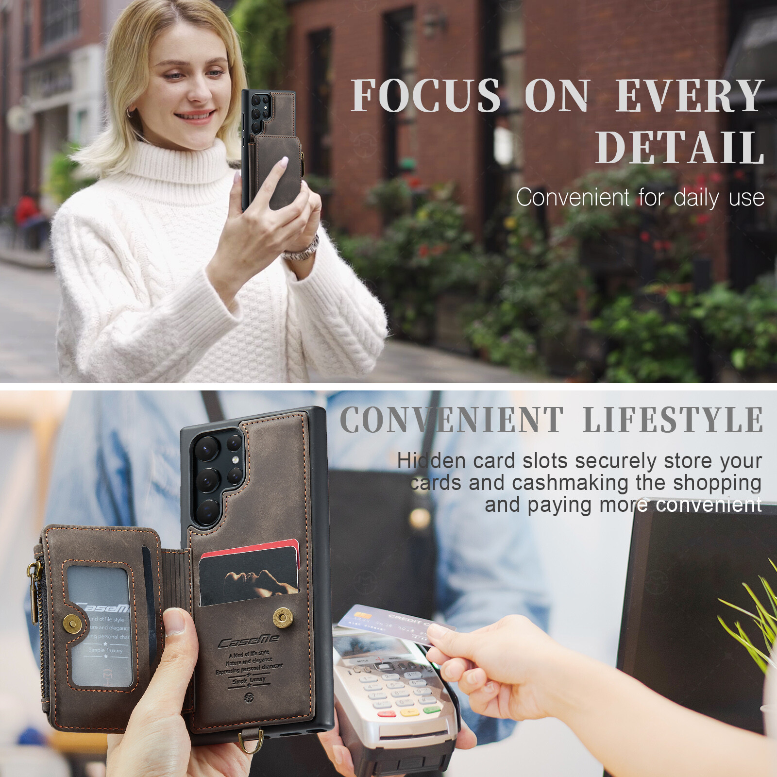What's in the Package? 1 x CaseMe AMZ Hot Wallet back Case (Phone not included)/ Quality-Checked 2 x UltraThin, FingerPrint Unlock , Smooth, High-Clear, High-S ensitivity, Touch ID- S ensitivity, Curved Full Coverage GLASS Screen Protector ( 2 kits / Including accessory) / optional Note: ( in Bulk pack in phone case / No retail packing) 2 x UltraThin, Smooth, High-Clear, High-S ensitivity, Touch ID- S ensitivity, Fingerprint Unlock, SOFT Curved Full Coverage Screen Protector ( 2 kits / Including accessory) / optional Note: ( in Bulk pack in phone case / No retail packing) 2 x Premium 3D integrated 9H Camera Lens Protector ( 2 kits / Including accessory) / optional Note: ( in Bulk pack in phone case / No retail packing) Wallet Phone Case For Samsung Galaxy S23 Ultra 5G Zipper Card Holder Stand Leather Cover Description CaseMe Samsung Galaxy S23 Ultra wallet case is made of Premium PU Leather & durable TPU inner bumper, make it has a stylish look and good touch feel. Reinforced stitching makes it more durable and protective. This Wallet Case with RFID Shield features can block radio waves and keep your wallet safe. With has 3 Slots for Credit Card, 1 Waterproof Zipper will be so convenient to store coins, keys&cash, it meets all your daily demand. Double Magnetic Clasp hold the cards in and not pop open. The removable lanyard strap provides a optional griping method. CaseMe Samsung Galaxy S23 Ultra Wallet Case Main Features: 1) Durable PU leather and flexible TPU to provide comfortable handtouch feeling. 2) RFID Blocking material protect your private information, up to 3 card slots. 3) Carry bills,coins and small cash easily and the pounch in wallet provide extra protection of privacy. 4) Double Magnetic Clasp Cover Flip Case can confirm your cards and cash safety and security. 5) Wrist Strap Easy to carry, it is a super functional wallet for everyday use, Ideal for carrying outside. 6) The TPU case with raised edge and extra cushioning covers the whole phone with full body protection on the front and back.