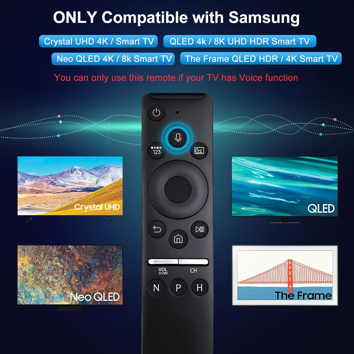 Store New Arrivals Add to Favorite View Feedback Replacement Voice Remote for Samsung Smart Tvs, for Samsung Crystal UHD QLED Curved 4K 8K Smart Tvs(2020/2021) Description Item model number 1312a Item Weight 1.76 ounces Color Black Product Dimensions 6.1 x 1.2 x 0.6 inches Country of Origin China Compatible Devices Television Max Number of Supported Devices 1 Batteries 2 AA batteries required. Manufacturer LOUTOC Special Feature Universal, Ergonomic, Lightweight, Voice Search Brand LOUTOC Size 1312a 【Notice】This NEW upgraded replacement for Samsung tv remote BN59-01312A only works for Samsung Smart TVs with Voice function(check if it has Voice at the TV Setting), for your Samsung tv remote with voice function 【Pairing to TV】Insert 2*AA batteries. Press and hold the “Return" and "Play/Pause" button simultaneously for 5 seconds until the TV screen shows that the pairing is completed. (Note: Batteries and user manual are NOT included) 【Compatible Models】BN59-01312A / BN59-01300F for Samsung Smart TV Series: QN90A, QN900A, QN800A, QN85A, Q80A, Q70A, Q60A, QN800B, QN90B, QN95B, QN85B, AU8000, Q900TS, Q60T, TU9010 Series etc 【Only for Voice remote】BN59-01312A / BN59-01300F for Samsung Voice Remotes: BN68-13897A, BN59-01363A, BN59-01330A(BN59-01329A), BN59-01330N, BN68-11568A, BN59-01330A, BN59-01330H etc 【3 Streaming Channels】Transmits a signal over long distances (>8m/24ft) + response time of 0.5 seconds! Comes with voice function, Netflx, Primvideo, Hulu buttons, which helps you access into your favourite show by one click Product Description Replacement Voice Remote for Samsung Smart TVs, for Samsung-TV-Remote, for Samsung Crystal UHD QLED Curved 4K 8K Smart TVs(2020/2021) Note: One TV can only be paired with one remote at a time !!! You can only use this remote if your TV has Voice function(check if it has voice function at the TV Setting)! For Samsung TV Series: QN90A, QN900A, QN800A, QN85A, Q80A, Q70A, Q60A, QN800B, QN90B, QN95B, QN85B, AU8000, Q900TS, Q60T, TU9010 Series etc. For Samsung Voice Remotes: BN68-13897A, BN59-01363A, BN59-01330A(BN59-01329A), BN59-01330N, BN68-11568A, BN59-01330A, BN59-01330H etc.. For Samsung TVs: QN800BFXZA QN90BAFXZA QN95BAFXZA QN85BAFXZA AU8000FXZA QN90AAFXZA QN900AFXZA QN800AFXZA QN85AAFXZA Q80AAFXZA Q70AAFXZA Q60AAFXZA Q900TSFXZA Q60TAFXZA LS03TBFXZA LS03AAFXZA LST9TAFXZA LS24AM506NNXZA UN86TU9010FXZA AM50. ABOUT US We offer the best prices around on high quality products. Our E-store includes media such as books, movies, music and games while offering electronics, toys, sporting apparel, clothing, tools, general home, garden items and more. SHIPPING We are always working hard to ensure your package arrives as soon as possible. Please understand that some factors like weather, high postal traffic, and the performance of shipping companies are outside of our control. We offer free shipping to the lower 48 states and ship within 2 business days of payment, usually sooner. We do not accept P.O. Boxes. Please provide a physical address. RETURNS We offer a 30-Day Return Policy on items which you are not completely satisfied with. You have the option for a full-refund or an exchange of the item. No returns are available on items shipped outside of the USA. PAYMENT We accept PayPal. CONTACT US This page content is yet to come Please ad us to your favorite seller and visit again later Thank You