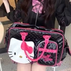 This Sanrio Hello Kitty shoulder bag is perfect for any Y2K or anime enthusiast. The bag features a zip closure and a pink leather handle/strap with gold hardware. The exterior is made of matte pink leather with applique, zipper, and embroidered accents. The bag has a large capacity and is perfect for carrying all your essentials. The bag is lined with satin and has inner pockets for easy organization. It is lightweight and packable, making it perfect for travel. The bag also has a bag charm accessory and is eco-friendly. The Hello Kitty Pink Leather Tote Bag product line is made in Japan and is a must-have for any collector.