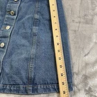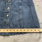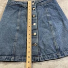 The Sans Souci Blue Denim Skirt is a stylish and versatile piece for women in size medium. This A-line skirt features a six-button front closure, solid blue color, and is made of comfortable cotton denim fabric. With a medium wash and a short length, this skirt is perfect for various occasions like travel, parties, or casual outings. The skirt is machine washable and has a stretch feature. See photos for measurements D25-585