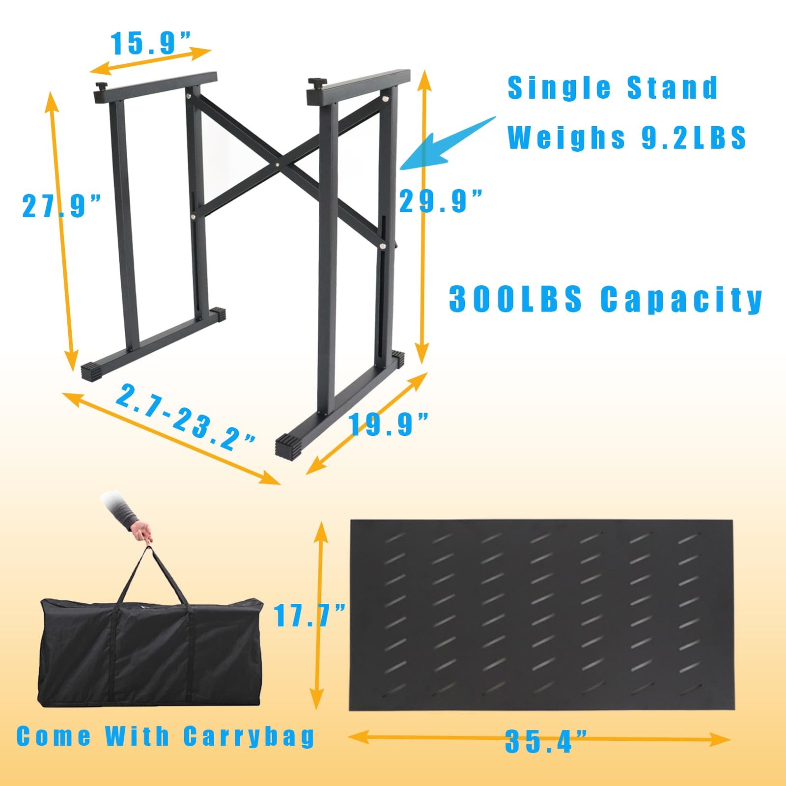 Sardoxx Adjustable DJ Stand Portable DJ Audio Mixer Stand Angled Foldable DJ Table Studio Music Synth Stand w/35” x 17.7” Table Top and Carry Bag For Laptop, Drum Machines, DJ Controller, Keyboard, DJ Turntables, Audio Rack Music Equipment This DJ Table Stand is specially designed for DJ and working event. Provides a professional look in DJ event. It can also be used for DJ Controller, DJ Mixer, DJ Audio Gear, Synthesizer, Turntable, Keyboard, Laptop, Digital Piano etc. Build your DJ workstation easily with DJ Booth. Widely used for band performances, studio practice, stage and DJ performances. Easily sets up at a show, wedding, or church. The width can be adjusted between 2.4 inches and 23.2 inches to fit different sized devices. Tilting top for easy viewing and control of devices. Anti-slip rubber feet add stability to the DJ Stand, preventing it from tipping and sliding. Anti-Slip Stoppers can be optionally installed to accommodate different usage scenarios. This DJ Stand can be used without tabletop and weighs only 9.2 lbs. Pre-assembled, easily unfolds for use. Put the tabletop on to hold more and bigger devices. The tabletop also fits X Braced Keyboard Stand (requires additional purchase, top tube length less than 16 inches). Comes with a professional carry bag to take the DJ Stand with you, total weight 18 lbs. The medium size is easy to carry or put in the car. Package include: 1x Adjustable Width Stand; 1x 35.4” x 17.7” Table Top; 1x Travel Bag; 2x Anti-Slip Stoppers. Material: Steel. Color: Black. Weight Capacity: 300 lbs. Weight without tabletop: 9.2 lbs. Total Weight(Weight with tabletop&carrybag): 18 lbs. About Return If you find any defects, please contact us for replacement within one month after receiving the items. Contact us We provide technical support and service at any time, please contact us if you have any questions, we will reply in one business day. Please check your spam if you do not receive our response within one business day. This DJ Table Stand is specially designed for DJ and working event. Provides a professional look in DJ event. It can also be used for DJ Controller, DJ Mixer, DJ Audio Gear, Synthesizer, Turntable, Keyboard, Laptop, Digital Piano etc. Build your DJ workstation easily with DJ Booth. Widely used for band performances, studio practice, stage and DJ performances. Easily sets up at a show, wedding, or church. The width can be adjusted between 2.4 inches and 23.2 inches to fit different sized devices. Tilting top for easy viewing and control of devices. Anti-slip rubber feet add stability to the DJ Stand, preventing it from tipping and sliding. Anti-Slip Stoppers can be optionally installed to accommodate different usage scenarios. This DJ Stand can be used without tabletop and weighs only 9.2 lbs. Pre-assembled, easily unfolds for use. Put the tabletop on to hold more and bigger devices. The tabletop also fits X Braced Keyboard Stand (requires additional purchase, top tube length less than 16 inches). Comes with a professional carry bag to take the DJ Stand with you, total weight 18 lbs. The medium size is easy to carry or put in the car. Package include: 1x Adjustable Width Stand; 1x 35.4” x 17.7” Table Top; 1x Travel Bag; 2x Anti-Slip Stoppers. Material: Steel. Color: Black. Weight Capacity: 300 lbs. Weight without tabletop: 9.2 lbs. Total Weight(Weight with tabletop&carrybag): 18 lbs.