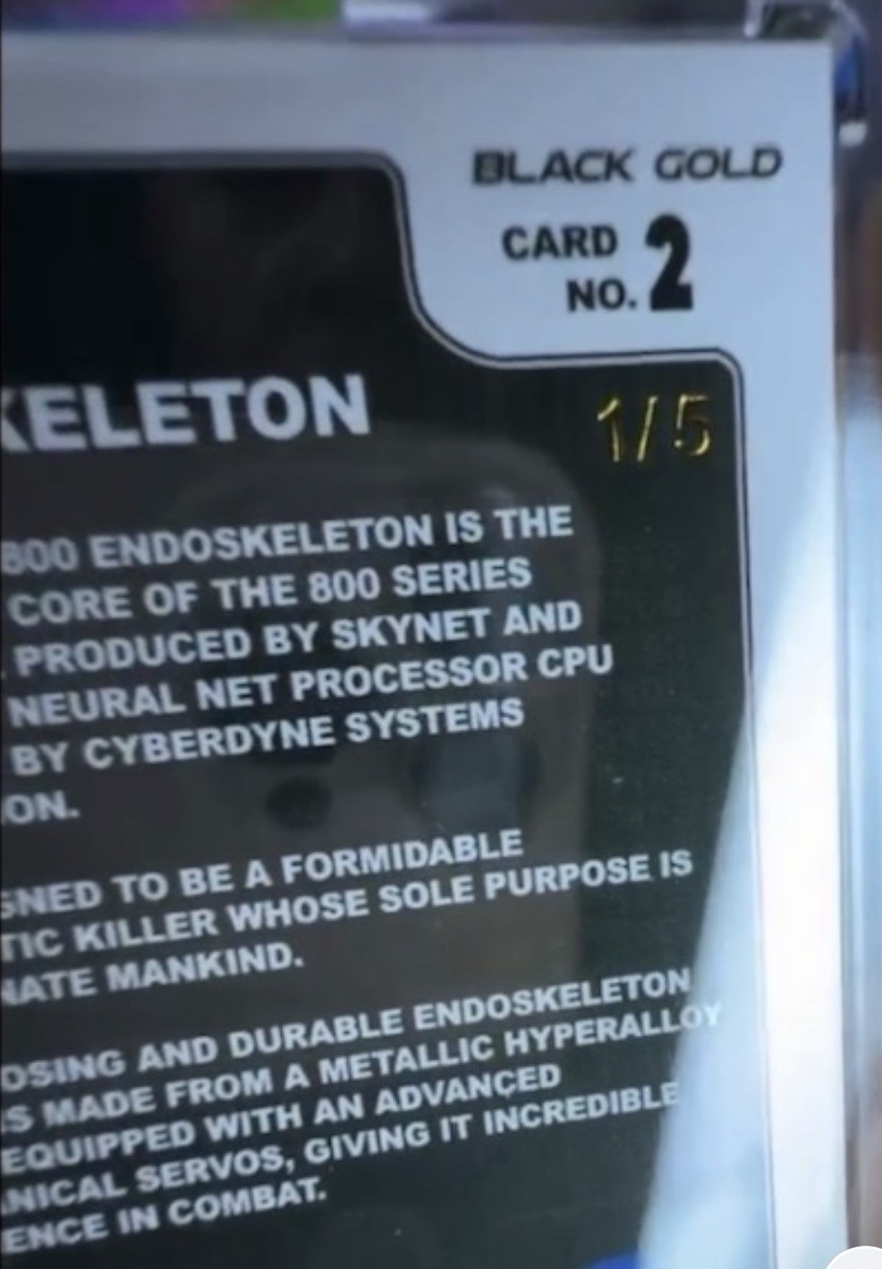 The product is a rare and highly sought-after 2024 Terminator 2 Black Gold trading card, limited to a print run of only 2. This non-sport trading card featuring the iconic Terminator franchise is in near mint condition and is considered a valuable collectible for fans and collectors. With only 5 cards in existence, this specific card is a prized possession for any Terminator enthusiast looking to add a unique piece to their collection. Very rare card.