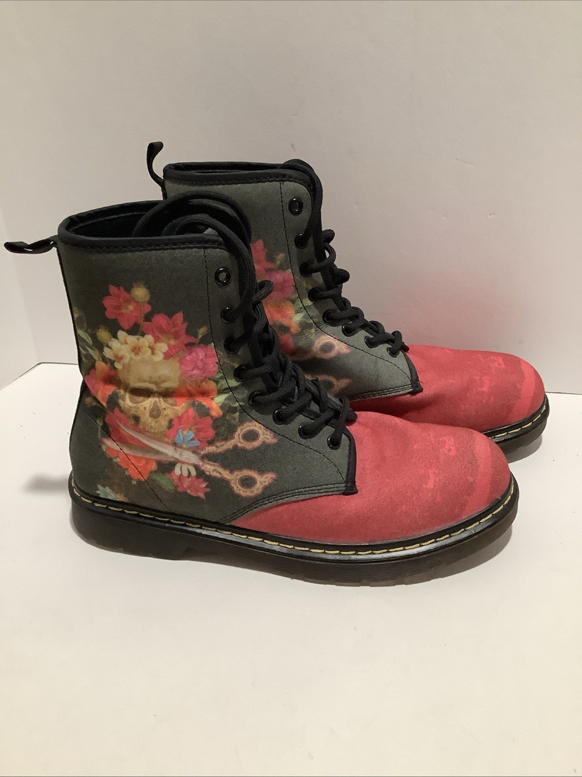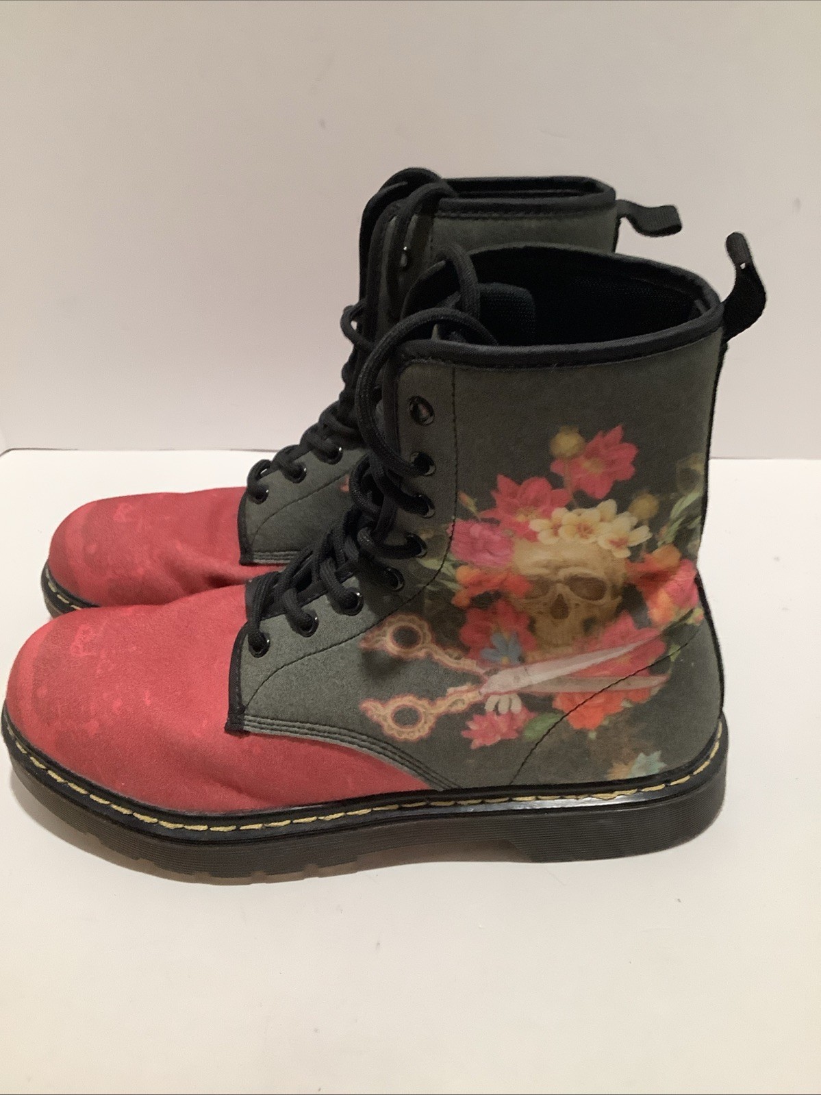 These Scissors Power Skull Women's Size 10 Textile Combat Gothic Lace Up Boots are a stylish and edgy addition to any wardrobe. Featuring a round toe shape, low heel, and ankle shaft style, they offer both comfort and durability. The boots are accented with stitching details and have a gothic pattern, making them perfect for a variety of occasions from casual outings to workwear. Made with blended fabric upper material and a foam insole, these boots are cushioned for added comfort and have a block heel style. The red color and unique design make them stand out for any goth or alternative fashion lover. Excellent clean condition, like new. Ships USPS parcel select.